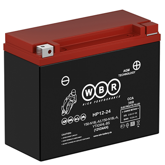 HP12-24 – герметизированные, выполненные по технологии AGM, стартерные мотоциклетные свинцово-кислотные аккумуляторные батареи WBR (HIGH PERFORMANCE) серии HP обладают высоким качеством и надежностью. Эти аккумуляторные батареи успешно выдерживают конкуренцию со стартерными батареями этого класса других производителей, соответствуют техническим характеристикам и являются аналогом мотоциклетных аккумуляторных батарей YUASA серий Y50-N18L-A, Y50-N18L-A3, YTX24HL-BS. Они предназначены для эксплуатации на мотоциклах, скутерах, гидроциклах, квадроциклах, снегоходах и мотовездеходах.