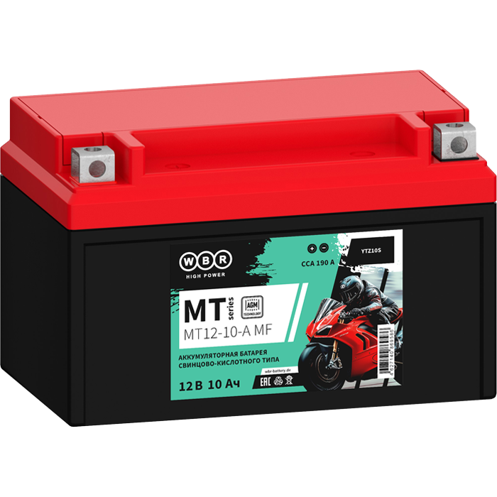 Герметизированные, выполненные по технологии AGM, стартерные мотоциклетные свинцово-кислотные аккумуляторные батареи WBR серии MT12-10-A MF обладают высоким качеством и надёжностью. Эти аккумуляторные батареи успешно выдерживают конкуренцию со стартерными батареями этого класса других производителей, соответствуют техническим характеристикам и являются аналогом мотоциклетных аккумуляторных батарей YUASA. Они предназначены для эксплуатации на мотоциклах, скутерах, гидроциклах, квадроциклах, снегоходах и мотовездеходах.