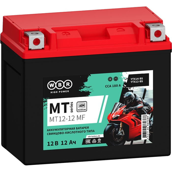 Герметизированные, выполненные по технологии AGM, стартерные мотоциклетные свинцово-кислотные аккумуляторные батареи WBR серии MT12-12 MF обладают высоким качеством и надёжностью. Эти аккумуляторные батареи успешно выдерживают конкуренцию со стартерными батареями этого класса других производителей, соответствуют техническим характеристикам и являются аналогом мотоциклетных аккумуляторных батарей YUASA. Они предназначены для эксплуатации на мотоциклах, скутерах, гидроциклах, квадроциклах, снегоходах и мотовездеходах.