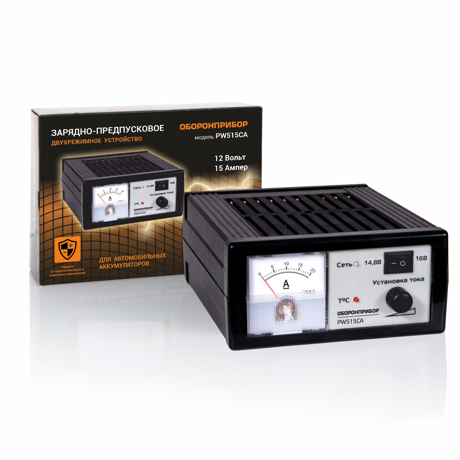Зарядное устройство двухрежимное импульсное ОБОРОНПРИБОР PW 515CA для АКБ Импульсное зарядное устройство ОБОРОНПРИБОР PW 515CA применяется для заряда 12В стандартных свинцово-кислотных автомобильных аккумуляторов и АКБ типа Са-Са от 40 до 120 А/ч.  Имеет 2 режима работы и функцию плавной регулировкой тока. В устройство встроена защита от переполюсовки и короткого замыкания, а также термозащита с индикацией.  Модель оснащена зажимами для подключения к аккумуляторной батарее и стрелочным индикатор тока. После ручной настройки с помощью регулятора работает в автоматическом режиме, по окончанию зарядки переходит в «режим ожидания». ОБОРОНПРИБОР PW 515CA – это надежное и простое в эксплуатации импульсное зарядное устройство. Автоматическое зарядное устройство  Для Са-Са аккумуляторов  Функция плавной регулировки тока  Защита от переполюсовки Защита от перегрева с микровентилятором Защита от короткого замыкания Автоматический переход в «режим ожидания» Стрелочный индикатор тока Зарядное устройство Инструкция по эксплуатации Гарантийный талон Импульсное зарядное устройство Заряд аккумуляторов 12В Выходной ток 0,4-15 А  Выходное напряжение в режиме стабилизации напряжения: режим 14.8В – 14.9-15,1В / режим 16В - 15,8-16,3 В  Выходное напряжение в режиме стабилизации тока –0-15 / 0-16 В  Емкость заряжаемого аккумулятора: 40-120А/ч. Диапазон питающего напряжения 180-240В, 50Гц. Производитель: ООО «НПП «Оборонпромприбор» Страна производства: Россия Масса: 0,970 кг Габариты (мм): 210 x 155 x 85 Объем: 0,0033 куб.м Упаковка: картонная коробка