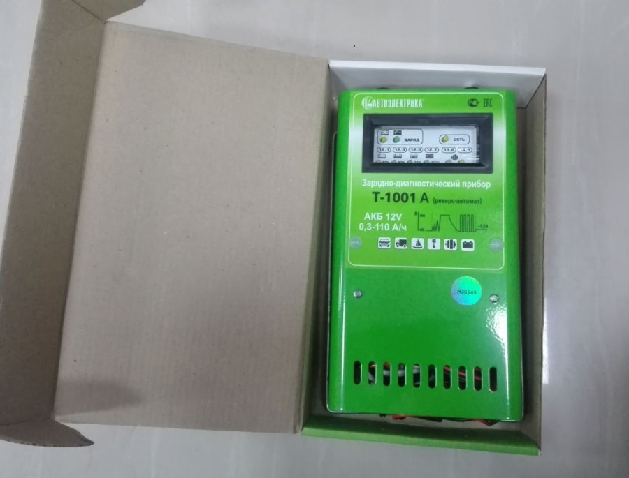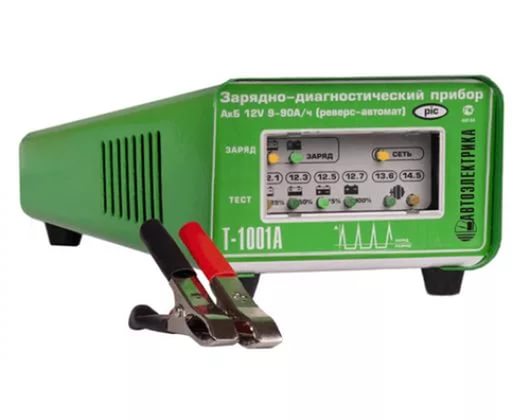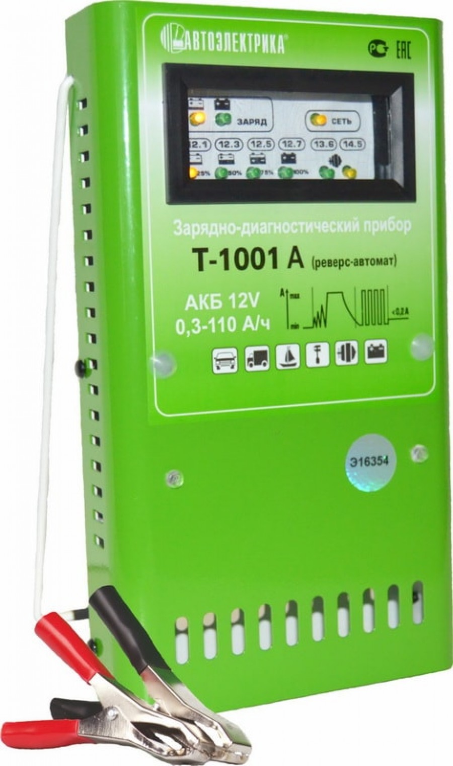 ЗАРЯДНО-ДИАГНОСТИЧЕСКИЙ ПРИБОР Т-1001А РЕВЕРС-АВТОМАТ Зарядно-диагностический прибор Т-1001А (реверс-автомат), предназначен для: - зарядки стартерных АКБ; - зарядки батарей в автоматическом режиме со стабилизацией по напряжению; - поддержания работоспособности батареи при хранении; - контроля текущего напряжения и уровня заряда; - проверки работоспособности генератора, реле регулятора. Рекомендуется использовать для зарядки всех типов АКБ, а так же для профилактических работ по устранению процесса сульфатации пластин, эффекта повышенного внутреннего саморазряда АКБ. Тип АКБ:  WET,AGM,GEL Напряжение АКБ: 12 V Емкость АКБ: 6 а/ч - 110 а/ч Управление зарядом: автоматическое Индикация: световая Защита: от короткого замыкания выходных полюсов, неправильного подключения полярности, перегрузки по теплу элементов прибора, включения при отсутствии батареи.
