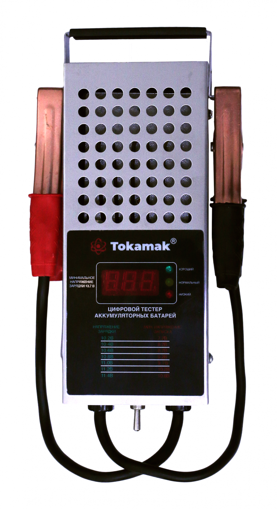 Тестер аккумуляторных батарей Tokamak TNV-002C Незаменимый помощник в области ремонта транспортных средств и систем контроля  аккумуляторов, а также в области продаж аккумуляторов. Предназначен для определения исправности и степени заряда АКБ всех типов (STD, GEL, AGM, EFB) напряжением 8 и 12В емкостью до 235 А/ч, а также диагностики работоспособности стартеров, реле регуляторов, генераторов и бортовой сети. Характеристики: - измеряет напряжение на клеммах АКБ в состоянии покоя. Определяет степень заряда и исправности автомобильных аккумуляторных батарей с номинальным напряжением 8/12 В; - измеряет напряжение на клеммах (имитация запуска двигателя) с напряжением аккумуляторной батареи - 12 В; - ёмкость тестируемых аккумуляторных батарей - до 235 А*ч; - диапазон вольтметра - 0-15 В; - точность – 0,1; - номинальное сопротивление спирали - 0.1 Ом ± 5 %; - максимальный ток нагрузки - 125А; - рабочий диапазон температур -30 - +40 °С; - время измерения: подключение спирали не более 5 сек. - большой вольтметр облегчает считывание показаний; - устойчивое к коррозии покрытие корпуса прибора; - измеряет корректность работы генератора и бортовой сети с помощью высокоточного вольтметра; - измеряет фактическую силу пускового тока.