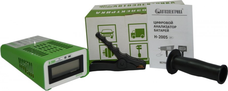 Анализатор батарей Н-2005 предназначен для замера и отображения основных параметров работоспособности стартерных аккумуляторных батарей таких как - текущее напряжение (ЭДС), напряжение под нагрузкой, ток пуска. С отображением дополнительной информацией на индикаторе: - АКБ не пригодна к эксплуатации; - превышения напряжения на клеммах; - превышение допустимой температуры прибора; - плохой контакт прибора с клеммой АКБ. Характеристики: Индикация цифровая Разрешающая способность 0,01  Измеряемое напряжение (ЭДС) 0,6 V – 20 V Продолжительность измерения неограниченно Испытуемые батареи под нагрузкой:   стартерные 12 V Емкость испытуемых батарей 6 а/ч - 250 а/ч  Ток нагрузки 200 А Измеряемое напряжение под нагрузкой 0,6 V – 20 V Продолжительность измерения под нагрузкой 3 – 5 сек. Защита от: КЗ, переплюсовки, искрообразования,  неправильного подключения полярности Индикация:   напряжение на клеммах АКБ больше 20 V U STOP превышение температуры нагрузки в приборе t STOP плохой контакт с клеммами АКБ и приборп C STOP Эксплуатация при:   Температуре от -20ºС до + 40 ºС Атмосферном давление 740-760 мм рт.ст Относительной влажности до 80% Габаритные размеры 255х115х200 мм Масса прибора 0,963 кг.