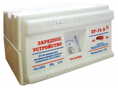 Применяется для заряда 12В кислотных автомобильных аккумуляторов 45-90 Ач. ЗУ с двумя режимами зарядного тока «4А» и «6А». В зарядное устройство встроена защита от переполюсовки, короткого замыкания и перегрева (термозащита) с индикацией. Модель оснащена зажимами для подключения к аккумуляторной батарее и проводами подключения к АКБ. Устройство упаковано в индивидуальную коробку. В ЗУ встроен амперметр для контроля выходного тока. Трансформаторное зарядное устройство ЗУ-75А является надежным и простым в эксплуатации. Характеристики: Тип устройства Трансформаторный Рабочее напряжение 12 В Выходной ток 6±0,5 А Потребляемая мощность 6А, не более – 100Вт Напряжение автоматического отключения 14,2-14,5 В Емкость заряжаемого аккумулятора 45-90А/ч. Питающая сеть 220В, 50Гц Вес 2 кг Габариты (мм) 250x180x140 Производитель «Оборонприбор» Страна производства Россия