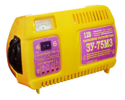 Зарядное устройство трансформаторное ЗУ-75М3. Применяется для заряда 12В кислотных автомобильных аккумуляторов 40-75 Ач. ЗУ с двумя режимами зарядного тока «4А» и «6А». В зарядное устройство встроена защита от переполюсовки, короткого замыкания и перегрева (термозащита) с индикацией. Модель оснащена зажимами для подключения к аккумуляторной батарее и проводами подключения к АКБ. Устройство упаковано в индивидуальную коробку. В ЗУ встроен амперметр для контроля выходного тока и индикатор ЭДС аккумуляторной батареи. Трансформаторное зарядное устройство ЗУ-75МЗ является надежным и простым в эксплуатации. Характеристики: Тип устройства Трансформаторный Рабочее напряжение 12 В Выходной ток 6±0,5 А Потребляемая мощность 6А, не более – 100Вт Напряжение автоматического отключения 14,2-14,5 В Емкость заряжаемого аккумулятора 40-75А/ч. Питающая сеть 220В, 50Гц Вес 1,75 кг Габариты (мм) 235x160x110 Производитель «Оборонприбор» Страна производства Россия