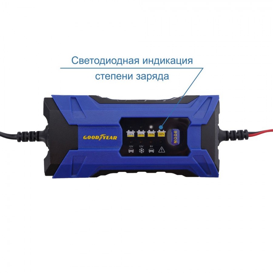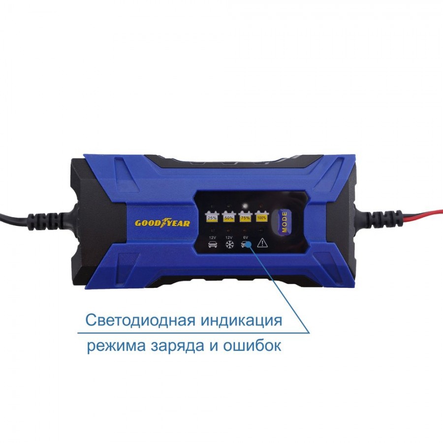 Электронное зарядное устройство нового поколения Goodyear Smart обеспечивает простой и удобный заряд АКБ авто- и мототехники. Особенности: Светодиодная индикация Зимний режим заряда аккумулятора Сложная многоэтапная система заряда гарантирует 100% заряд батареи. ЗУ имеет изолированные усиленные зажимы для подключения к аккумуляторной батарее. Модель имеет простую и удобную индикацию режима заряда, ошибок и степени заряда АКБ. По завершении заряда устройство переходит в режим хранения, индуцируя полную зарядку АКБ. Зарядное устройство  оснащено защитой от перегрузки, неправильного подключения и короткого замыкания. Подходит для заряда стандартного аккумулятора любого типа (WET, MF, GEL, AGM) емкостью 3-60Ач (6V/12V) с максимальным током 2А.