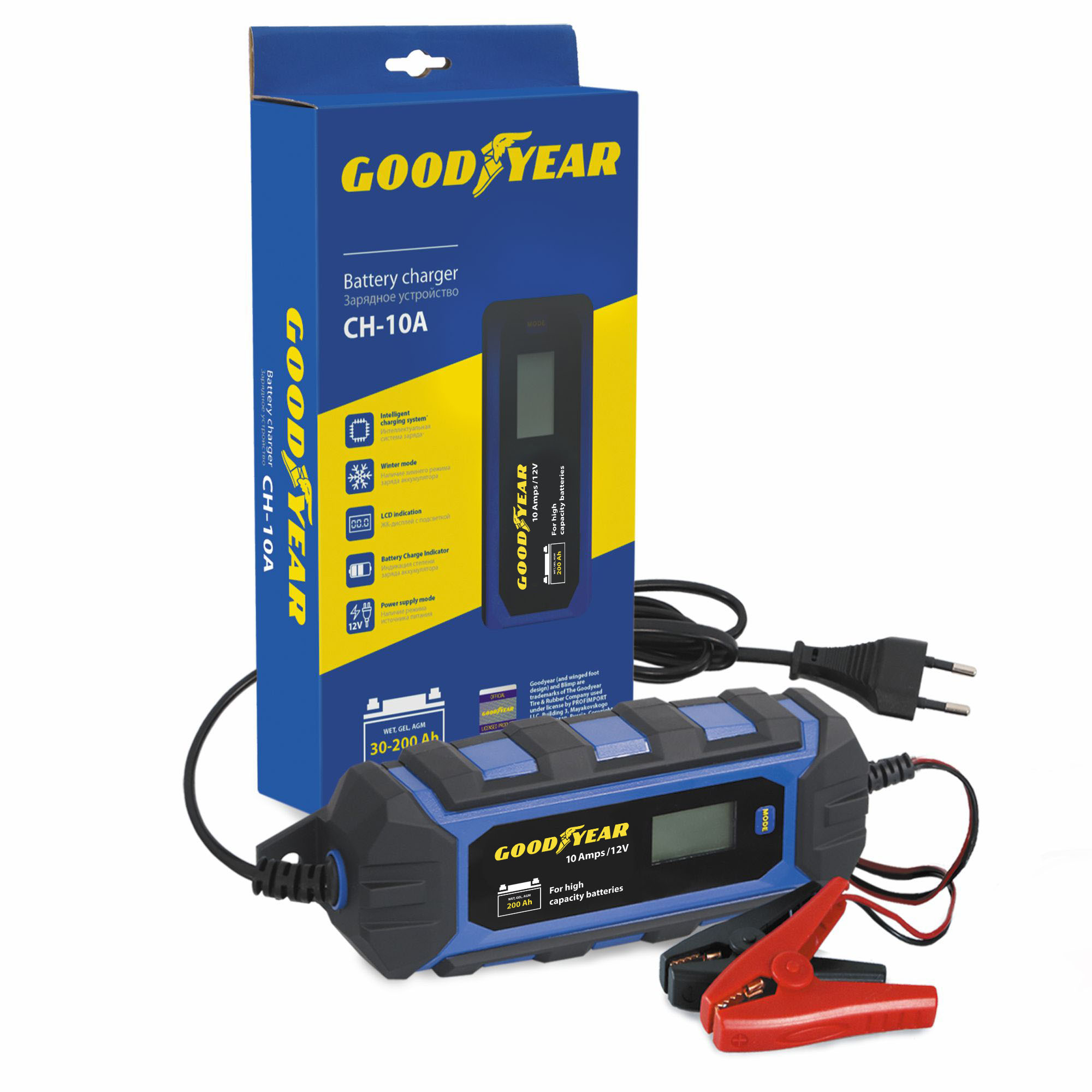 Электронное зарядное устройство нового поколения Goodyear Smart обеспечивает простой и удобный заряд АКБ авто- и мототехники. Подходит для заряда свинцово-кислотного аккумулятора любого типа (WET, MF, GEL, AGM) емкостью 30-200Ач (12V) с максимальным током 10А. Особенности: Зимний режим заряда аккумулятора. Имеет режим заряда аккумуляторов малой емкости. Информация о полной зарядке АКБ отобразится на ЖК-дисплее. По завершении заряда устройство  переходит в режим хранения. ЗУ Goodyear на 10А можно использовать как блок питания на 12 В. Достаточно отключить устройство, когда индикатор покажет заряд 100%. Модель имеет простую и удобную индикацию режима заряда, ошибок и степени заряда АКБ. Зарядное устройство оснащено защитой от перегрузки, неправильного подключения и короткого замыкания. Сложная многоэтапная система заряда, как по току, так и по напряжению, включающая режим восстановления АКБ, гарантирует 100% заряд батареи. Для подключения к аккумуляторной батарее ЗУ имеет усиленные зажимы типа «крокодил», изолированные морозостойким пластиком.