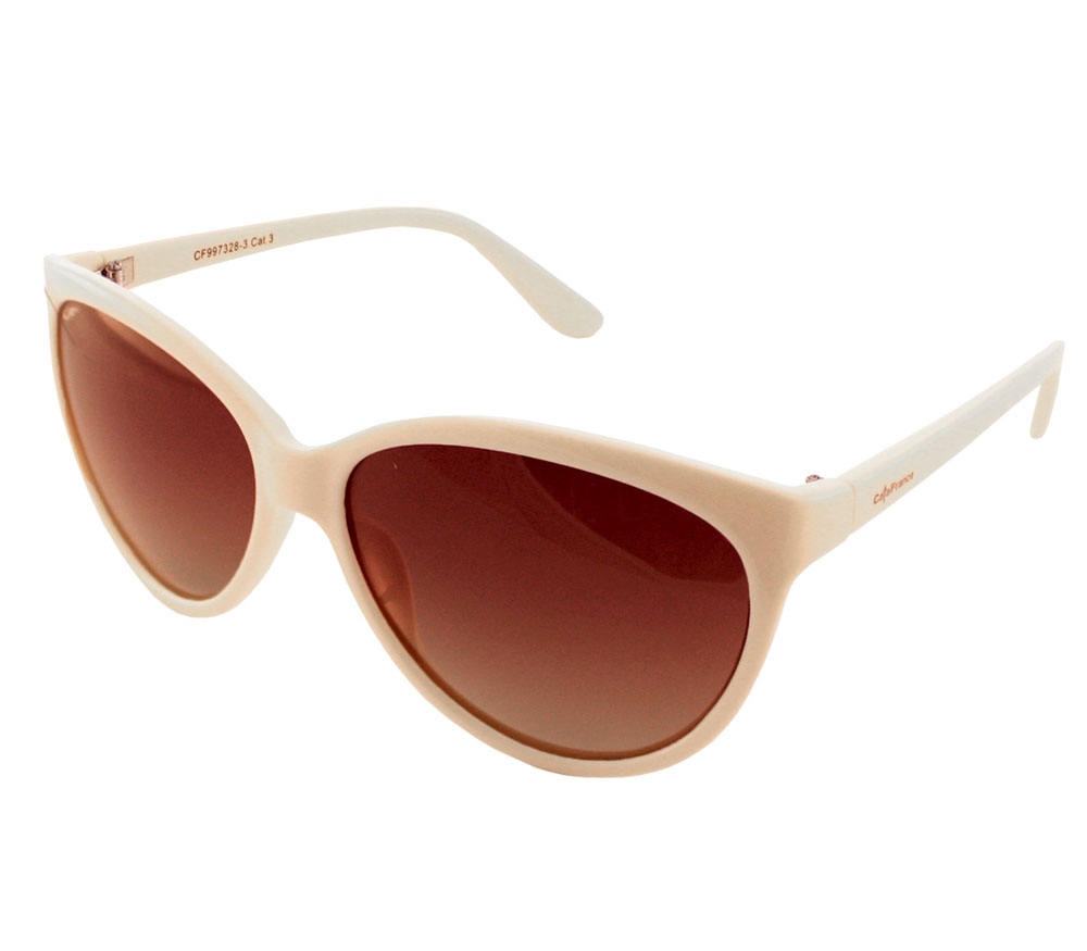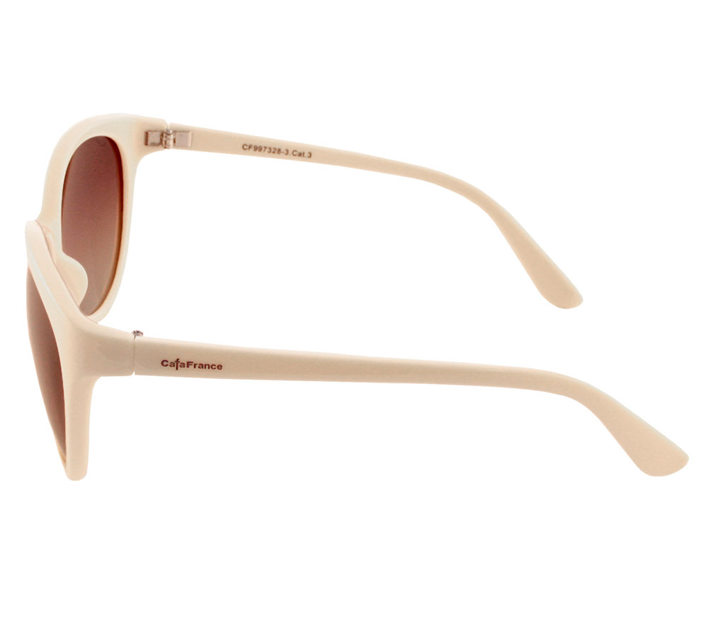 Солнцезащитные очки Cafa France с поляризационным фильтром. Эффектная женская модель CF997328 формы "Cat Eyes" (Кошачий глаз) с плавными линиями оправы, приятного молочного цвета и градиентными линзами. Дужки выполнены из бежевого глянцевого пластика. Линзы коричневого цвета данной модели имеют комфортную 3-ю степень затемнения и выполнены из качественного полимерного пластика - триацетат целлюлозы. Этот материал обладает рядом очень важных преимуществ: гипоаллергенный, прочный, легкий и обладает превосходной визуальной четкостью изображения. Поляризационные очки Cafa France защищают ваши глаза от вредного излучения (UVA, UVB, UVC), прямого и отраженного солнечного света, а также бликов на лобовом стекле автомобиля.