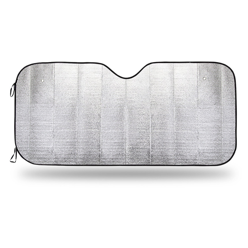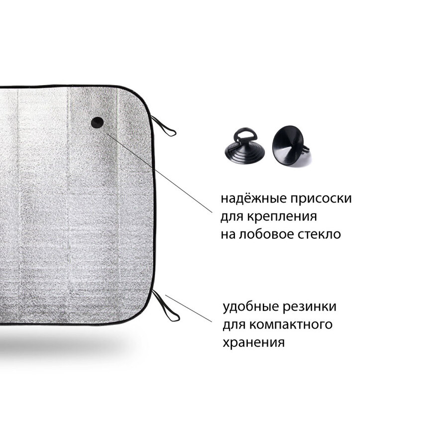 Солнцезащитный экран на лобовое стекло, светоотражающий, двухсторонний.  Экран имеет стандартный вырез для зеркала заднего вида и подходит на большинство современных автомобилей.  В качестве материала используется Foam - комбинированный 2-слойный материал: алюминиевая фольга и специальный вспененный материал (1,5 мм).  На стекло экран крепится с помощью идущих в комплекте присосок. Экран незаменим при продолжительных стоянках на открытых парковках, во время пикника или на пляже.  Он эффективно отражает солнечные лучи, защищая салон от перегрева и предотвращая выгорание материалов интерьера во время стоянок на открытом пространстве.