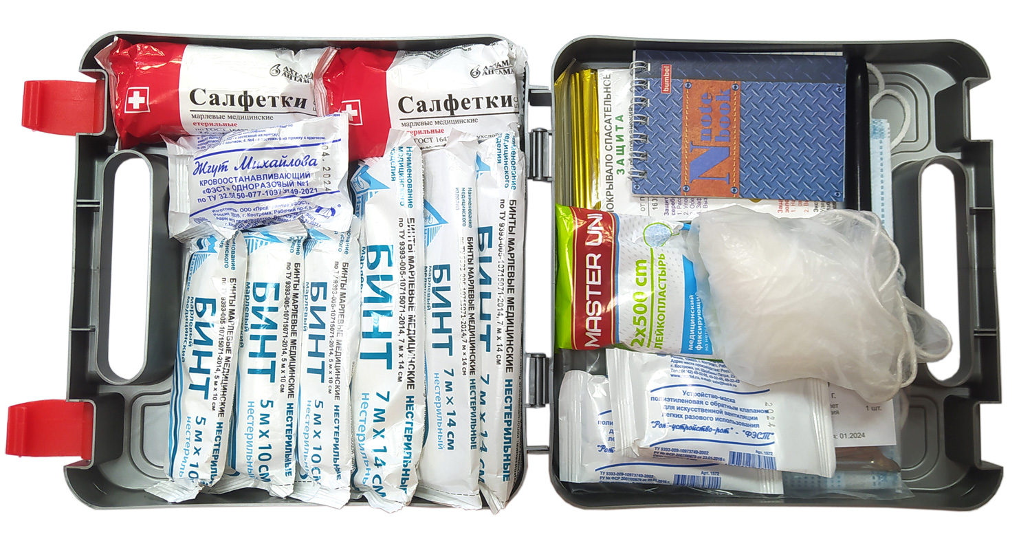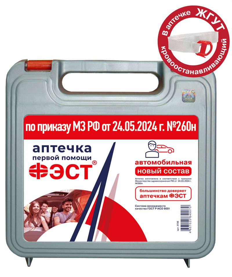 Автомобильная аптечка ФЭСТ – личная аптека в бардачке. Иметь аптечку для оказания само- и взаимопомощи в своей машине обязан каждый водитель. Об этом говорится в Правилах дорожного движения, действующих на территории Российской Федерации. Однако наборы медицинских изделий от различных производителей могут весьма существенно отличаться. Так, цена на автомобильную аптечку первой помощи зависит не только от входящих в ее состав вложений, но и от наценки производителя. Предприятие «ФЭСТ» предлагает приобрести аналогичный набор для автомобиля по доступной цене без потери в качестве и в комплектации. Содержание автомобильной аптечки «ФЭСТ»: Маска медицинская нестерильная одноразовая 2 шт. Перчатки медицинские нестерильные, размером не менее М 2 пары Устройство для проведения искусственного дыхания «Рот-Устройство-Рот» 2 шт. Жгут кровоостанавливающий для остановки артериального кровотечения              1 шт. Бинт марлевый медицинский размером не менее 5 м х 10 см или бинт фиксирующий эластичный нестерильный размером не менее 2 м х 10 см 3 шт. Бинт марлевый медицинский размером не менее 7 м х 14 см или бинт фиксирующий эластичный нестерильный размером не менее 2 м х 14 см 3 шт. Салфетки медицинские стерильные размером не менее 16 х 13 см № 10 2 уп. Лейкопластырь фиксирующий рулонный размером не менее 2 см х 500 см 1 шт. Покрывало спасательное изотермическое размером не менее 160 х 210 см 1 шт. Ножницы для разрезания перевязочного материала и ткани 1 шт. Инструкция по оказанию первой помощи с использованием аптечки для оказания первой помощи с применением медицинских изделий пострадавшим в дорожно-транспортных происшествиях (автомобильной) 1 шт. Блокнот формата не менее А7 1 шт. Маркер черный (синий) или карандаш 1 шт. Футляр или сумка 1 шт. Футляр пластмассовый 205×205×70 мм