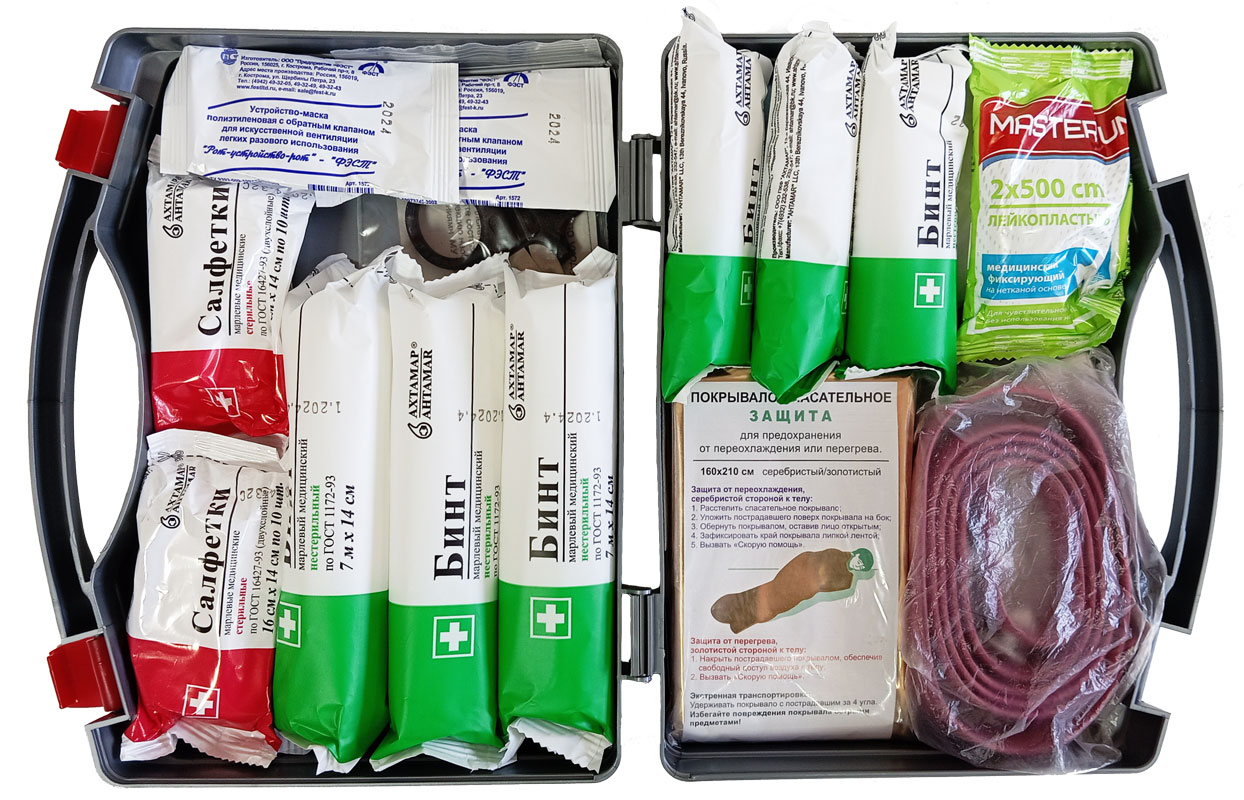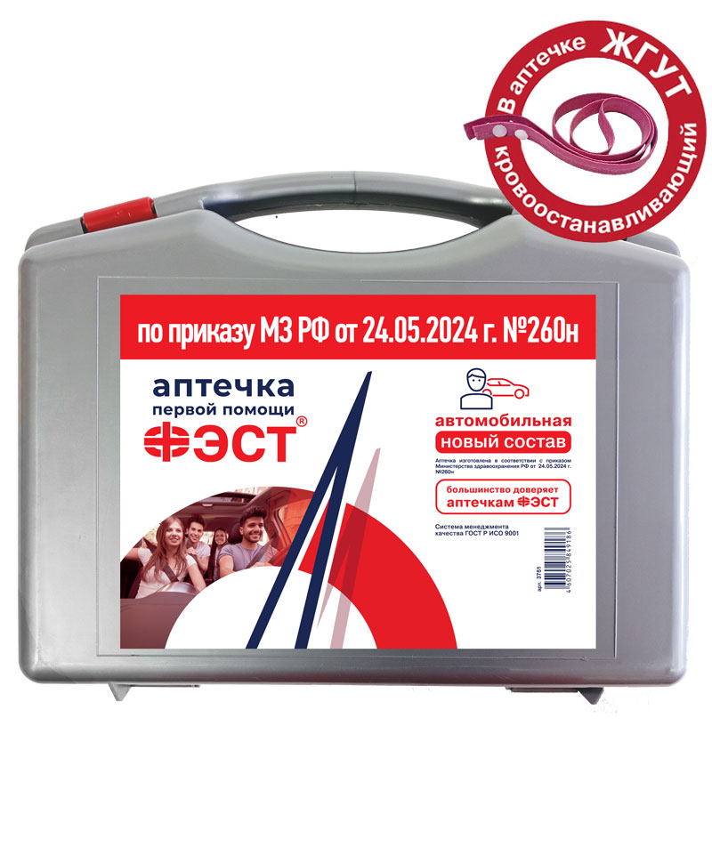 Автомобильная аптечка ФЭСТ – личная аптека в бардачке. Иметь аптечку для оказания само- и взаимопомощи в своей машине обязан каждый водитель. Об этом говорится в Правилах дорожного движения, действующих на территории Российской Федерации. Однако наборы медицинских изделий от различных производителей могут весьма существенно отличаться. Так, цена на автомобильную аптечку первой помощи зависит не только от входящих в ее состав вложений, но и от наценки производителя. Предприятие «ФЭСТ» предлагает приобрести аналогичный набор для автомобиля по доступной цене без потери в качестве и в комплектации. Содержание автомобильной аптечки «ФЭСТ»: Маска медицинская нестерильная одноразовая 2 шт. Перчатки медицинские нестерильные, размером не менее М 2 пары Устройство для проведения искусственного дыхания «Рот-Устройство-Рот» 2 шт. Жгут кровоостанавливающий для остановки артериального кровотечения              1 шт. Бинт марлевый медицинский размером не менее 5 м х 10 см или бинт фиксирующий эластичный нестерильный размером не менее 2 м х 10 см 3 шт. Бинт марлевый медицинский размером не менее 7 м х 14 см или бинт фиксирующий эластичный нестерильный размером не менее 2 м х 14 см 3 шт. Салфетки медицинские стерильные размером не менее 16 х 13 см № 10 2 уп. Лейкопластырь фиксирующий рулонный размером не менее 2 см х 500 см 1 шт. Покрывало спасательное изотермическое размером не менее 160 х 210 см 1 шт. Ножницы для разрезания перевязочного материала и ткани 1 шт. Инструкция по оказанию первой помощи с использованием аптечки для оказания первой помощи с применением медицинских изделий пострадавшим в дорожно-транспортных происшествиях (автомобильной) 1 шт. Блокнот формата не менее А7 1 шт. Маркер черный (синий) или карандаш 1 шт. Футляр или сумка 1 шт. Футляр пластмассовый 240×205×70 мм