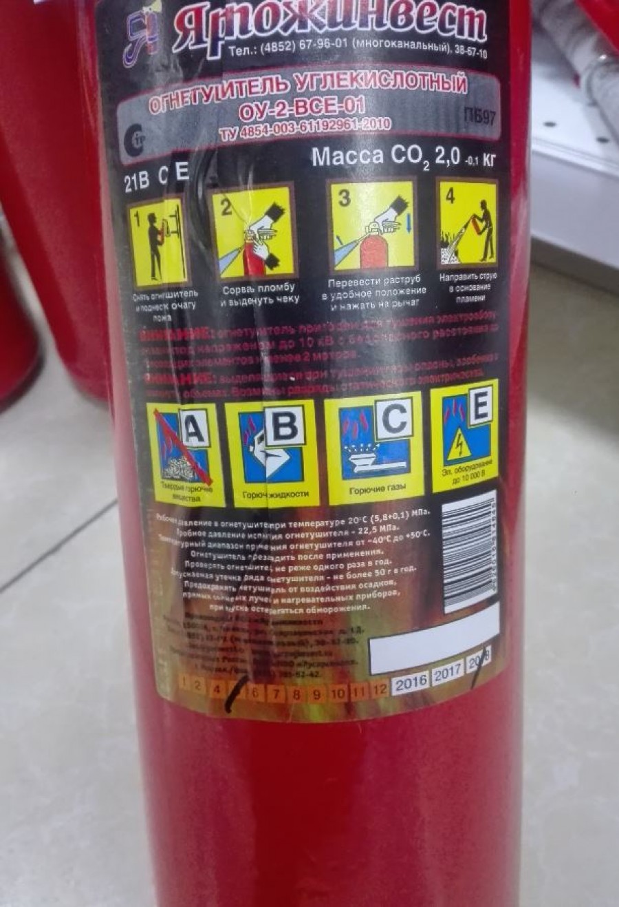Масса CO2 = 2 кг (- 0,1) Масса нетто = 7 кг (+/-) Углекислотные огнетушители предназначены для тушения различных веществ, горение которых не может происходить без доступа кислорода, загораний на электрифицированном железнодорожном и городском транспорте, электроустановок, находящихся под напряжением до 10 000 В, загораний в музеях, картинных галереях и архивах, широкое распространение в офисных помещениях при наличии оргтехники, а так же в жилом секторе. Основным преимуществом углекислотных огнетушителей является то, что двуокись углерода не повреждает объект тушения и не оставляет следов. Углекислотные огнетушители применяются для тушения следующих веществ: - горючие жидкости (В); - горючие газы (С); - электрооборудование (Е), находящееся под напряжением до 10 000 В. Углекислотные огнетушители не применяются для тушения: - твердых горючих веществ (А); - веществ, горение которых может происходить без доступа кислорода (Д), (алюминий, магний и их сплавы, натрий, калий); - электроустановок напряжением выше 10 000 В. Инструкция к применению: 1. Снять огнетушитель и подвести к очагу пожара. 2. Сорвать пломбу и выдернуть чеку. 3. Перевести раструб в удобное положение и нажать на рычаг. 4. Направить струю в основание пламени.