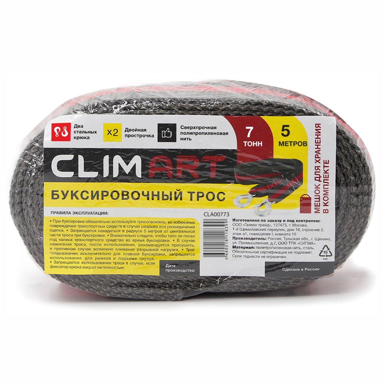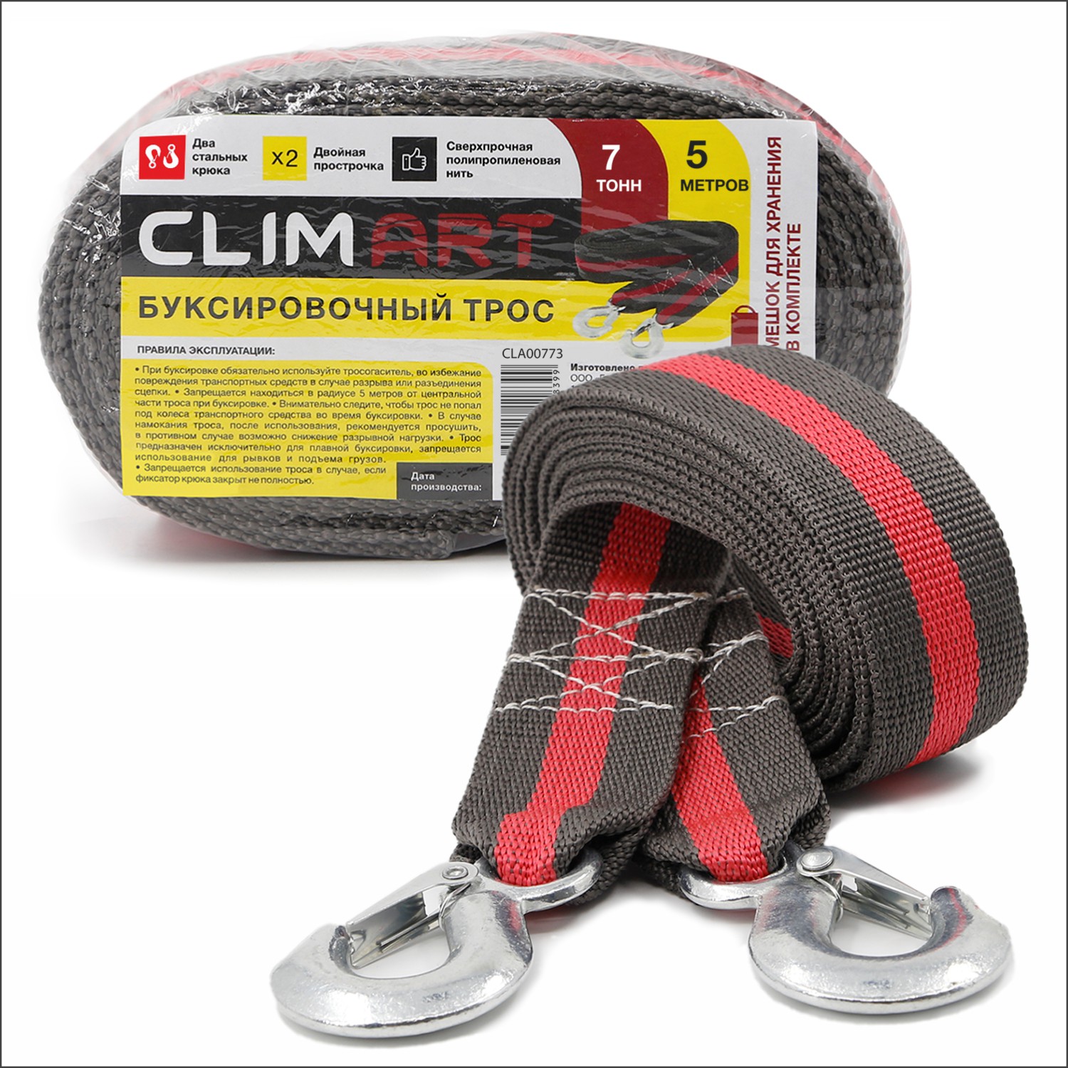 —Трос буксировочный Clim Art 7т 5м, 2 крюка с мешком, термоупаковка CLA00773