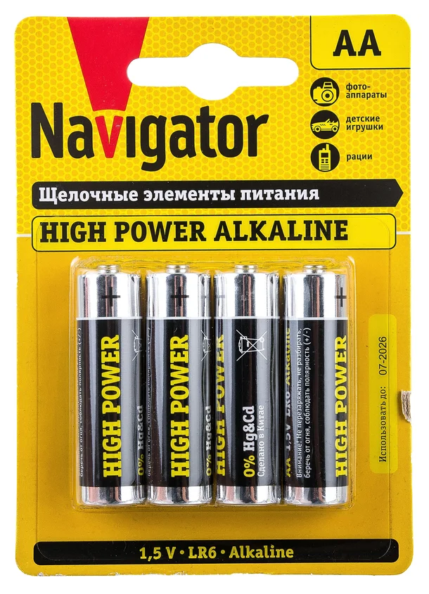 Элемент питания 94 753 NBT-NE-LR6-BP4 (блистер 4шт) Navigator Тип АА. Цена за блистер из 4 шт. Мощный и высокопроизводительный источник энергии. Изделие обладает высокими техническим характеристиками, полностью соответствует всем требованиям экологической безопасности. Подходит для совместного использования с устройствами среднего и высокого энергопотребления. Срок предэксплуатационного хранения - 5 лет. Диапазон рабочих температур от -30°C до +60°C.