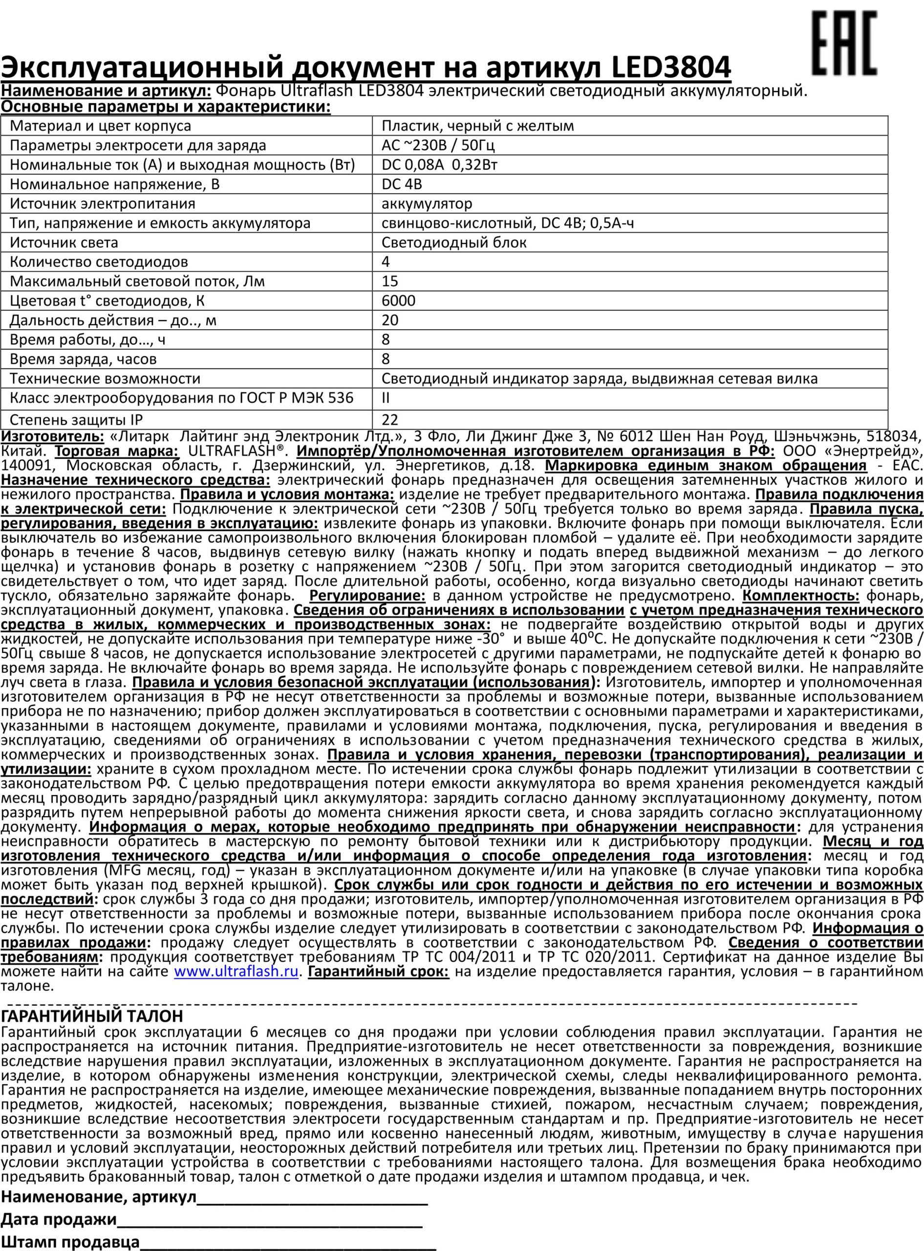 ХАРАКТЕРИСТИКИ: Цвет - Черный с желтым. Максимальный линейный размер фонаря, мм - 135. Размеры фонаря, мм - 70 x 135 x 70. Размер первичной упаковки, мм - 73 x 140 x 77. Применяемые элементы питания - Герметичный свинцово-кислотный аккумулятор 4 вольт 0,5 А*ч (в комплекте). Источники света - 4 LED. Потребляемая мощность(Вт) - 0,32. Соответствие лампе накаливания(Вт)     - 1,3. Цветовая температура, K - 6000. Световой поток(Лм) - 15. Материал корпуса    - пластик. Дистанция освещения — до 20 м, 1 режим работы, время работы — до 8 часов, выдвижная сетевая вилка,, IP22 Индивидуальная упаковка - цветная коробка.