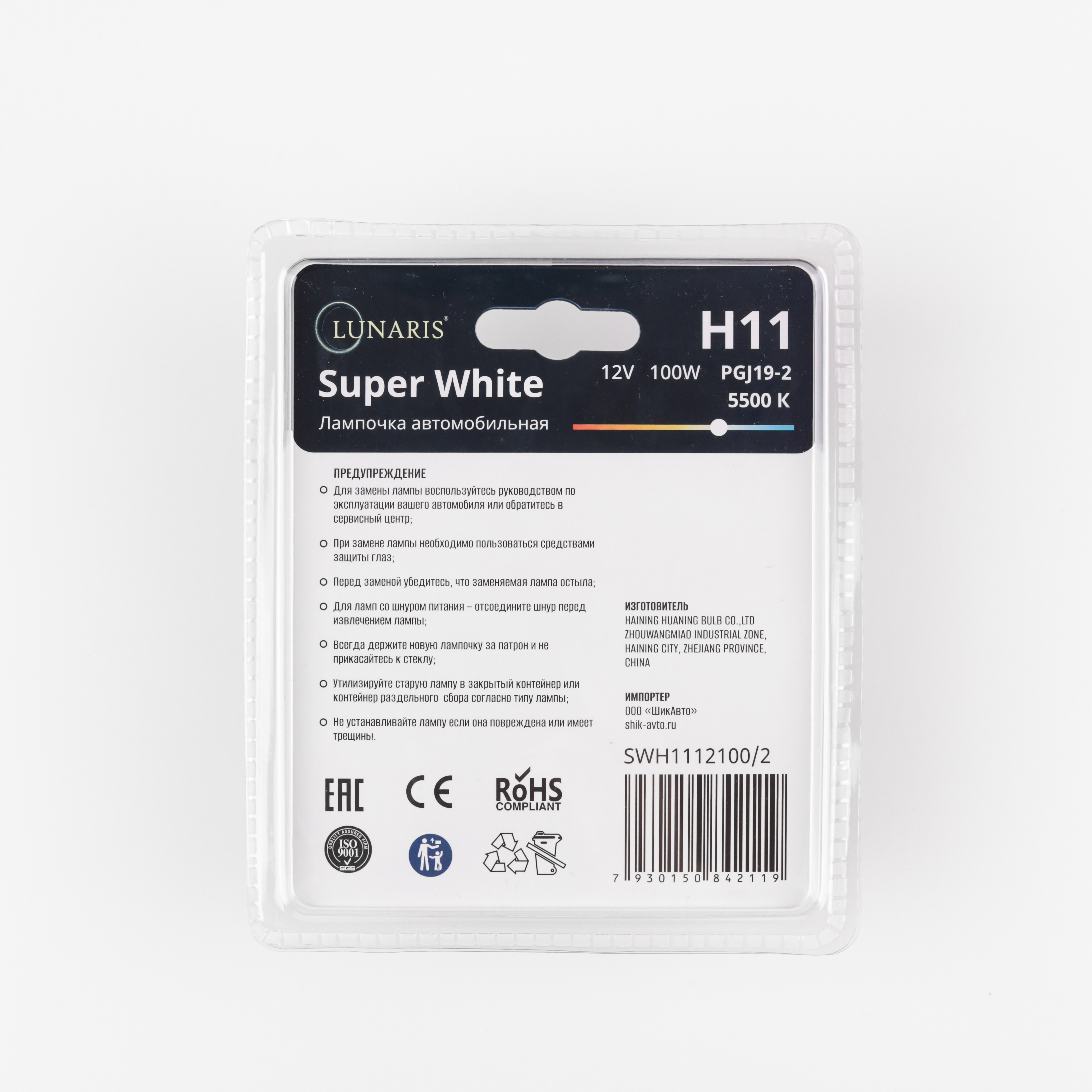 Лампа галогенная H11 12V 100W PGJ19-2 Super White 5500K (2шт. на блистере) LUNARIS
