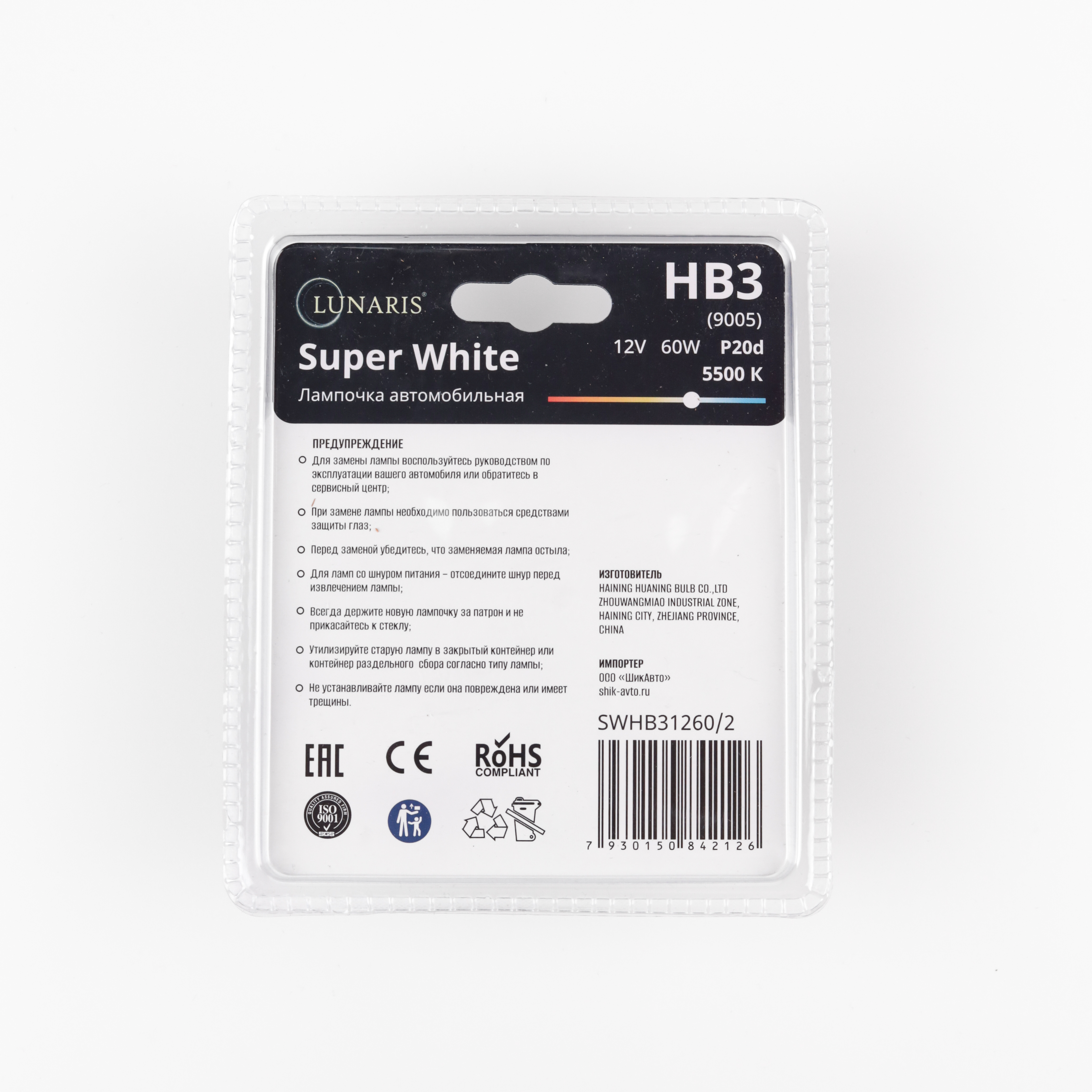 Лампа галогенная HB3/9005 12V 60W P20d Super White 5500K (2шт. на блистере) LUNARIS