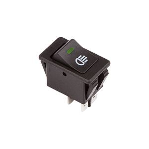 Выключатель клавишный 12V 35А (4с) ON-OFF с зеленой подсветкой предназначен для коммутации электрических цепей напряжением 12В. Такой клавишный переключатель применяются в качестве комплектующих изделий автотранспортного электрооборудования (в легковых и грузовых автомобилях, автобусах и других транспортных средствах). Клавиша включения внешнего освещения имеет два положения и подсветку. Принцип действия основан на перемещении клавиши в одну из позиций. Для переключения в нужное положение требуется приложить некоторые усилия на клавишу. Монтаж осуществляется без применения винтов на плоских панелях толщиной от 0.8мм до 3мм. Подключение клавиши осуществляется с помощью плоских клемм или пайкой контактов. Основные характеристики: Номинальное напряжение: 12В; Номинальный ток: 35A (12DC); Тип переключения: ON-OFF; Количество контактных групп: 2; Количество контактов в контактной группе: 2; Фиксация положений: да; Индикатор коммутационных положений: зеленый; Рабочая температура: от -25? до +85?; Ресурс: 10 000 циклов.