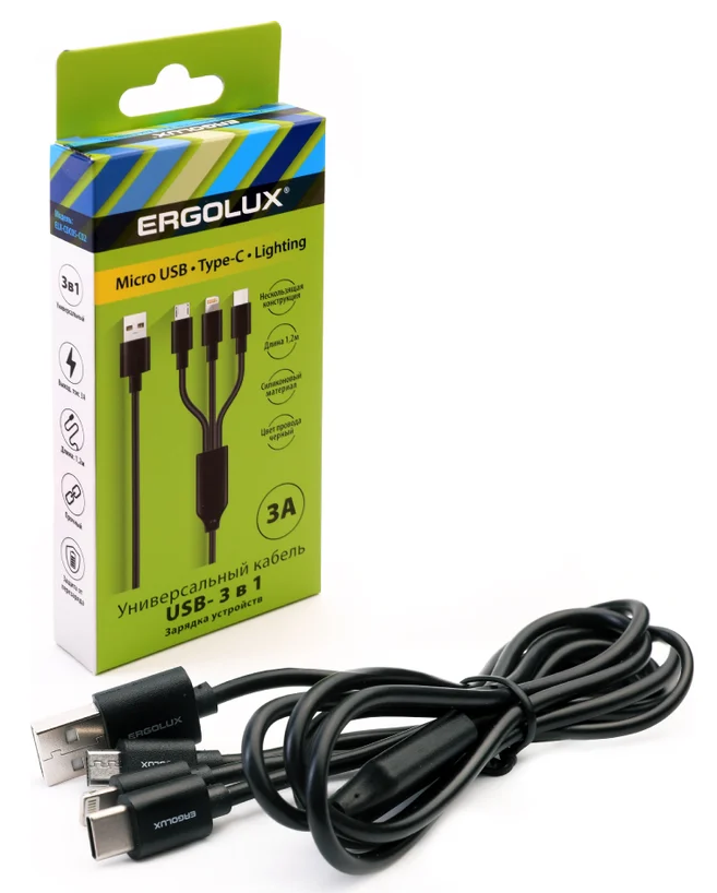—Кабель ERGOLUX ELX-CDC05-C02 3в1- Micro USB-Lightning-Type C, 3А, 1,2м зарядка коробка черный