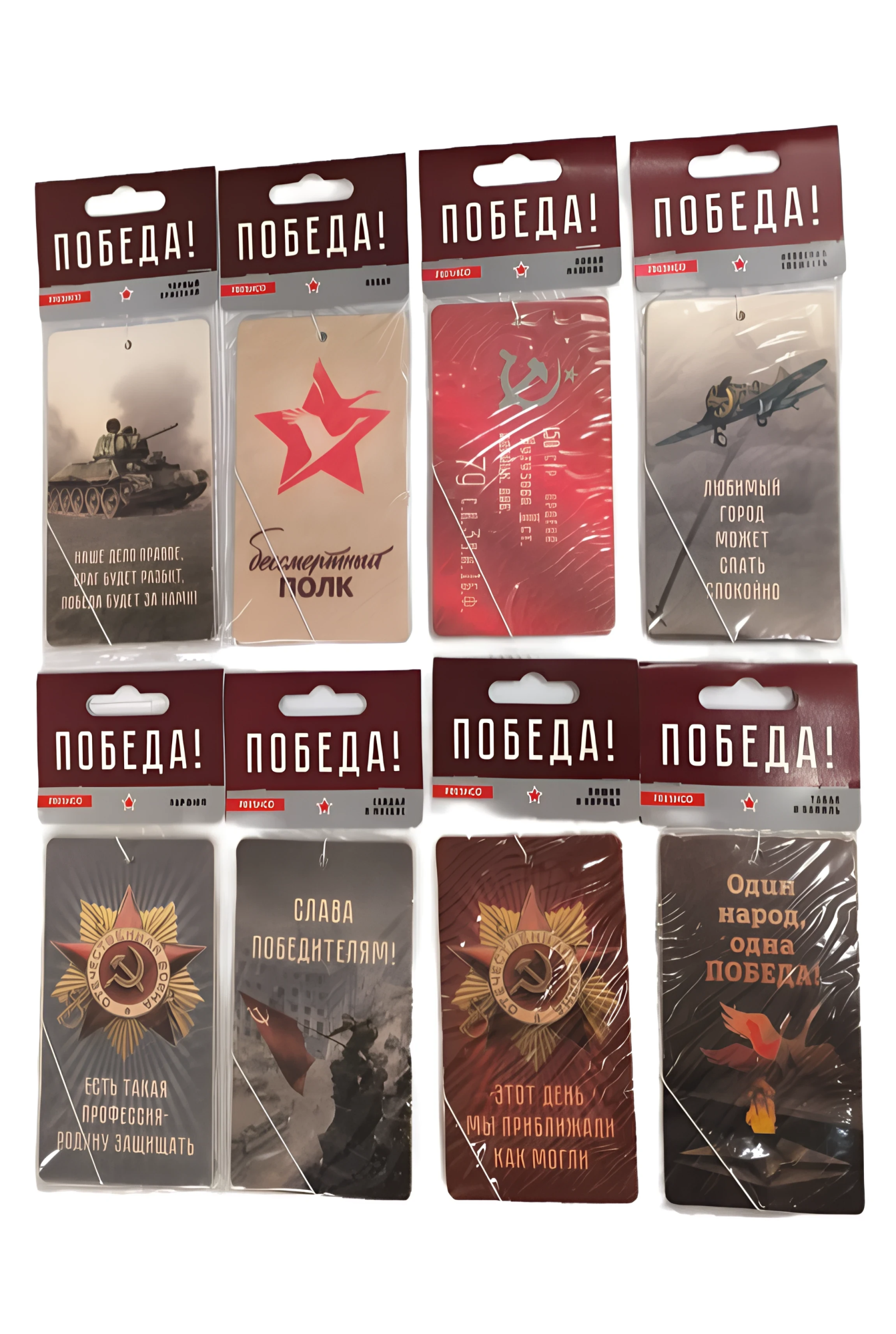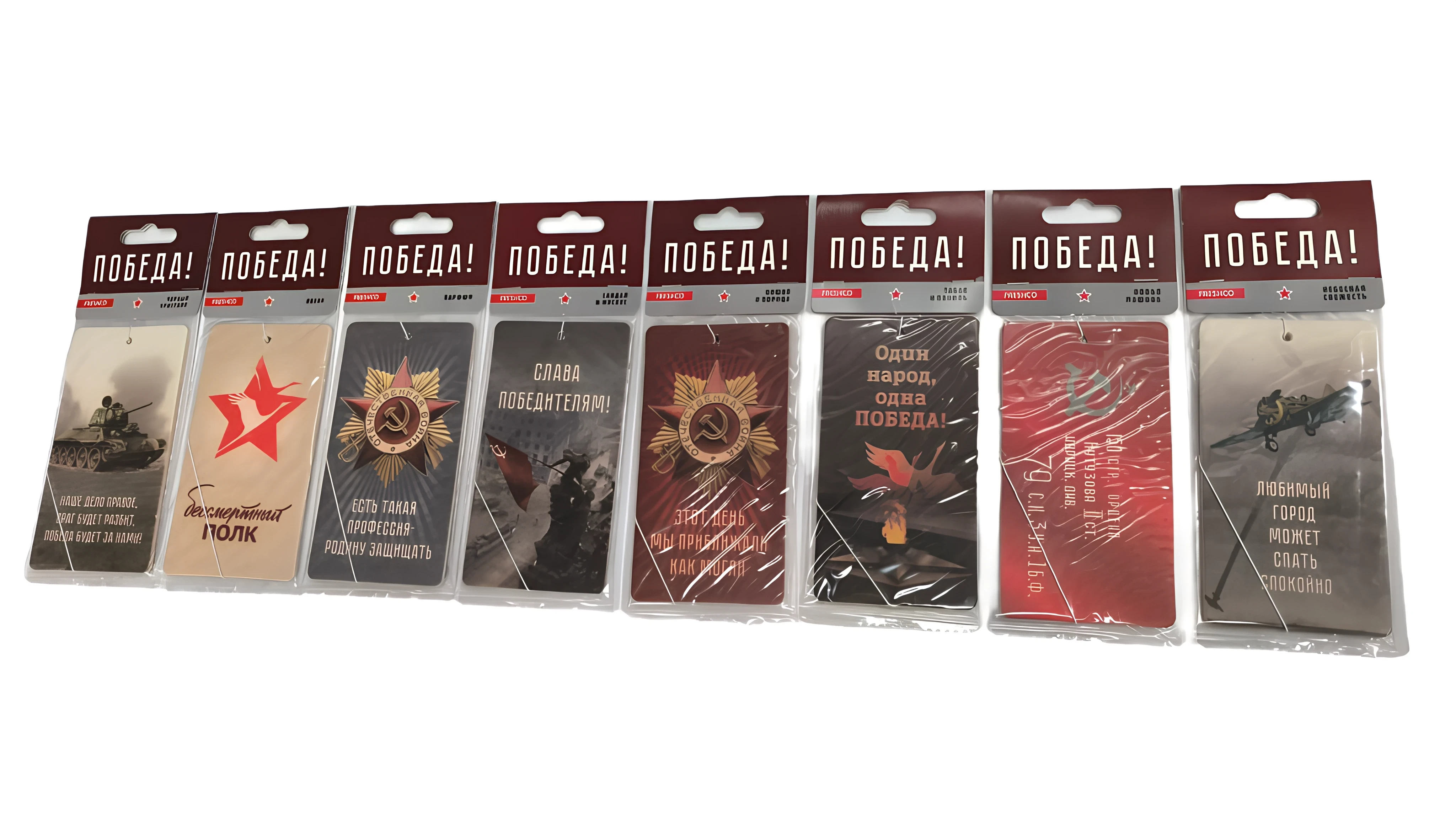 Ароматизатор воздуха подвесной на картонной основе "ПОБЕДА" - ассортимент в виде патриотичной надписи и изображения, выполненного в стиле времён ВОВ, подарит вам неповторимую атмосферу Великой Победы. Уникальная форма и дизайн ароматизатора станут не только приятным обонятельным сопровождением, но и стильным аксессуаром для вашего автомобиля. Ароматизаторы с различной парфюмерной композицией, обладают насыщенным ароматом, который мгновенно наполнит ваш автомобиль свежим и бодрящим запахом. Изготовлен ароматизатор из качественного, пропитанного, высококапиллярного картона, что обеспечивает его долговечность и стойкость к внешним воздействиям. Благодаря подвесному креплению, вы сможете разместить ароматизатор в любом удобном месте вашего автомобиля, выбрав оптимальное положение для распространения аромата.