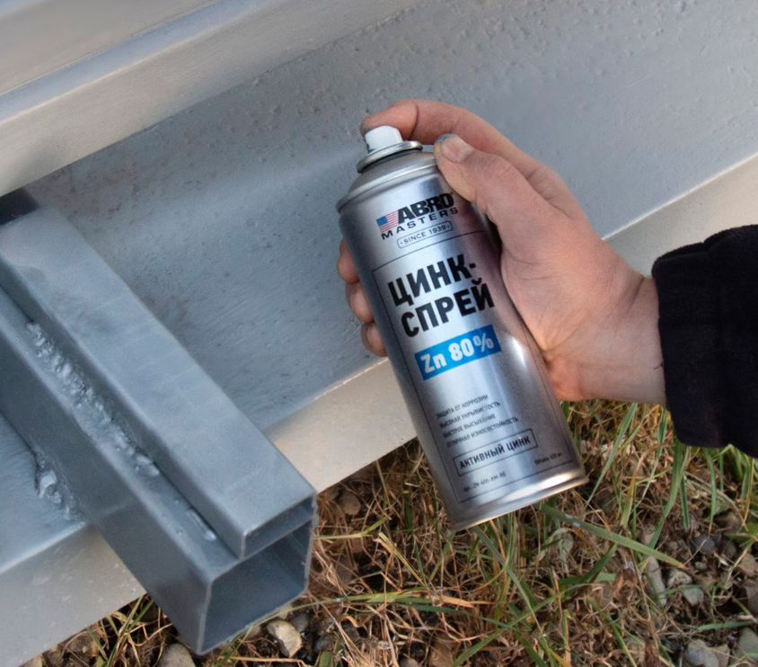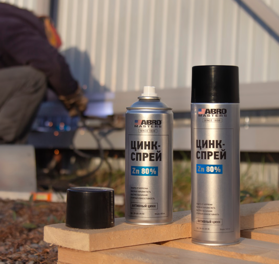 Цинк-спрей ABRO MASTERS 450 мл Описание: Инновационный цинковый состав для долговечной защиты металлов от коррозии. Сфера применения: Используется для обработки изделий из железа, стали и их сплавов, а также для восстановления участков цинкового покрытия. Свойства: Создает прочную барьерную пленку, предотвращающую контакт металла с водой, кислородом и агрессивными средами. Обладает высокой адгезией к большинству металлов и отличной износостойкостью. Благодаря высокой укрывистости создает защитный слой толщиной 40 мкм с первого нанесения. Подходит для точечной сварки. Позволяет защитить от коррозии детали любых форм и размеров без демонтажа. Обеспечивает активную защиту поверхности даже после нарушения целостности барьерного покрытия. Поддается окрашиванию. Применение: 1. Обрабатываемые поверхности должны быть очищены от ржавчины, влаги, грязи и старой краски. Для лучшего результата наносите состав при температуре от 21C. 2. Перед использованием хорошо потрясите баллон в течение 2−3 минут. Также периодически встряхивайте баллон во время работы. 3. Держите баллон параллельно обрабатываемой поверхности на расстоянии 10−15 см и наносите средство плавными перекрывающими движениями тонкими слоями. 4. Нанесите 1−2 слоя, позволяя предыдущему слою высохнуть в течение 5−8 минут. 5. После применения очистите распылитель, перевернув баллон и продув головку до прекращения выхода средства. Время высыхания на отлип — 8 минут. Время полного высыхания — 8 часов. Состав: Цинковый порошок, диметилэфир, акриловая смола, метиленхлорид, бутилацетат, этилацетат, функциональные добавки.