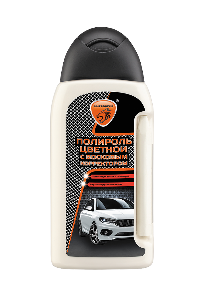 Предназначен для устранения мелких царапин и сколов лакокрасочной поверхности за счет заполнения их пигментированным составом и выравнивания плоскости светоотражения. Восковой корректор в комплекте помогает замаскировать глубокие царапины и сколы. Сочетание силиконового полимера и натурального воска, придёт лакокрасочному покрытию глубокий блеск и надолго защищает от разрушительного действия кислотных осадков, дорожных реагентов, ультрафиолетовых лучей и профессиональной химии, применяемой на автомойках. Легко наносится и располировывается. Подходит для всех типов лакокрасочных покрытий, в т. ч. «металлик», «перламутр» и «хамелеон», «ксиралик» и «кэнди». Одного флакона полироля достаточно для обработки трёх автомобилей средних размеров. Подходит для всех оттенков белого. Способ применения: использовать при температуре не ниже + 10 ?С. Вымыть кузов автошампунем ELTRANS®, протереть насухо замшей или чистой тканью. При наличии стойких загрязнений, дополнительно использовать универсальный очиститель или очиститель битума ELTRANS®. Хорошо встряхнуть флакон. Сначала замаскировать восковым карандашом царапины и сколы, предварительно обработать их мягким обезжиривателем. Внимание! Заполнять корректором царапину поперек её направления. Излишки воска по краям царапины стереть мягкой ветошью. Нанести полироль, избегая перерасхода, на слегка влажную губку. Равномерно, круговыми движениями, тонким слоем распределить полироль по обрабатываемому участку кузова. Дать подсохнуть составу (1-2 мин.) и отполировать мягкой тканью. Не пытайтесь нанести полироль на весь кузов автомобиля целиком! Обрабатывать кузов постепенно, нанося полироль на небольшие участки. Для получения наилучшего результата начинать полировку необходимо с верхних частей кузова, а заканчивать обработкой нижних частей.