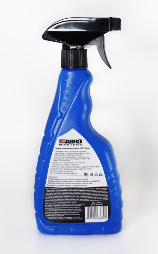 Чернитель-кондиционер для шин ABRO MASTERS Описание: Эффективное средство для чернения и защиты шин. Сфера применения: Предназначен для ухода, восстановления внешнего вида и увеличения срока службы шин, а также любых резиновых и пластиковых поверхностей. Свойства: Силиконовое масло в составе быстро и глубоко проникает в структуру резины, увлажняет её, придает глянцевый блеск и темный насыщенный цвет. Создает на поверхности защитный слой, устойчивый к УФ-излучению. Защищает шины от выгорания и потускнения. Предотвращает старение и растрескивание резины, продлевает её срок службы. Придает поверхности водоотталкивающий и антистатический эффект. Не смывается водой после высыхания. Может использоваться для консервации шин. Применение: 1. Обрабатываемая поверхность должна быть чистой и сухой. 2. Встряхните флакон перед использованием и нанесите состав на обрабатываемую поверхность. 3. Распределите состав по поверхности при помощи губки или ткани. Внимание: не допускайте попадания на тормозные колодки. Состав: Деионизованная вода, силиконовое масло, бензоат натрия, отдушка.