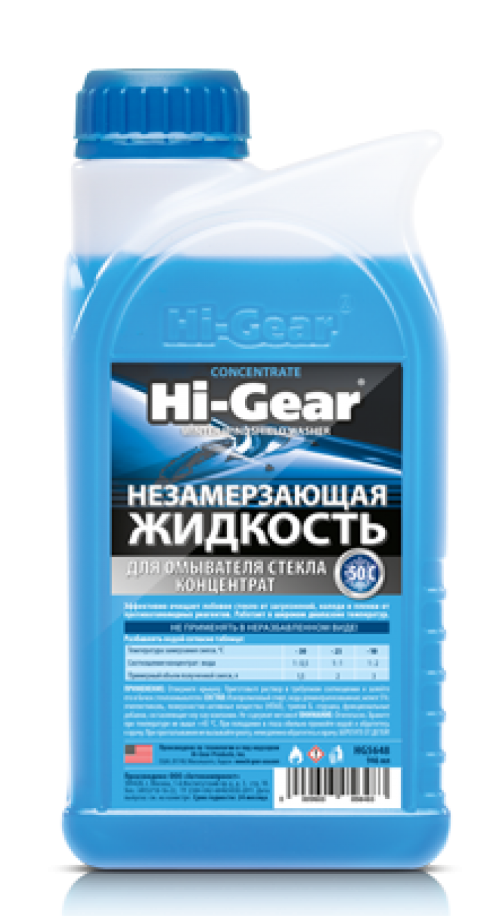 Незамерзающие жидкости относятся к категории товаров активной безопасности, серьезно влияя на уровень и качество обзора, а также на здоровье людей, находящихся в салоне автомобиля. Именно поэтому их качеству необходимо уделять повышенное внимание. Многочисленные лабораторные испытания и тесты, проводившиеся ведущими автомобильными изданиями, неоднократно подтверждали, что фактическая температура начала кристаллизации незамерзающей жидкости Hi-Gear точно соответствует температуре, заявленной на этикетке. Канистра, в которой поставляется жидкость, обеспечена защитой от подделок в виде рельефного логотипа Hi-Gear на горловине. НАЗНАЧЕНИЕ: для очистки автомобильных стекол и фар при отрицательных температурах до −50 °C. ДЕЙСТВИЕ: незамерзающая жидкость Hi-Gear благодаря входящим в ее состав поверхностно-активным веществам эффективно устраняет дорожные загрязнения и следы атмосферных осадков. Отличается улучшенными моющими и антиобледенительными свойствами.  СООТВЕТСТВИЕ ТРЕБОВАНИЯМ: стеклоомывающая жидкость Hi-Gear произведена в соответствии с законодательством РФ и не содержит вредный для здоровья людей метанол. СОВМЕСТИМОСТЬ: жидкость безопасна для лакокрасочного покрытия, щеток стеклоочистителя и других резиновых, пластиковых и металлических элементов автомобиля.