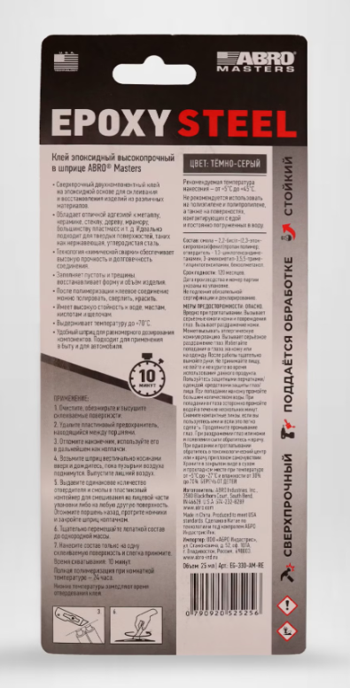 Клей эпоксидный высокопрочный в шприце ABRO MASTERS Описание: Сверхпрочный двухкомпонентный клей на эпоксидной основе в шприце. Сфера применения: Предназначен для склеивания и восстановления изделий из различных материалов, таких как металл, керамика, стекло, дерево, мрамор, большинство пластмасс и т. д. Идеально подходит для твердых поверхностей, таких как нержавеющая, углеродистая сталь. Свойства: • Обладает отличной адгезией. • Технология "химической сварки" обеспечивает высокую прочность и долговечность соединения. • Заполняет пустоты и трещины, восстанавливает форму и объём изделия. • После полимеризации клеевое соединение можно полировать, сверлить, красить. • Имеет высокую стойкость к воде, маслам, кислотам и щелочам. • Выдерживает температуру до +70°C. • Удобный шприц для равномерного дозирования компонентов. • Подходит для применения в быту и для автомобиля. Применение: 1. Очистите, обезжирьте и высушите склеиваемые поверхности. 2. Удалите пластиковый предохранитель, находящийся между поршнями. 3. Отломите наконечник, используйте его в дальнейшем как колпачок. 4. Возьмите шприц вертикально носиками вверх и дождитесь, пока пузырьки воздуха поднимутся. Выпустите лишний воздух. 5. Выдавите одинаковое количество отвердителя и смолы в пластиковый контейнер для смешивания на лицевой части упаковки либо на любую другую поверхность. Отожмите поршень назад, протрите кончики и закройте шприц колпачком. 6. Тщательно перемешайте лопаткой состав до однородной массы. 7. Нанесите состав только на одну склеиваемую поверхность и слегка прижмите. Время схватывания: 10 минут. Полная полимеризация при комнатной температуре — 24 часа. Низкие температуры замедляют время отвердевания клея. Рекомендуемая температура нанесения — от +5°C до +45°C. Не рекомендуется использовать на полиэтилене и полипропилене, а также на поверхностях, контактирующих с едой и постоянно погруженных в воду. Состав: Смола — 2,2-бис (п-(2,3-эпоксипропокси)фенил)пропан полимер; отвердитель — 1,3-циклогександиметанамин, 3-аминометил-3,5,5-триметилциклогексиламин, бензолметанол. Меры предосторожности: ОПАСНО. Вредно при проглатывании. Вызывает серьёзные ожоги кожи и повреждения глаз. Вызывает раздражение кожи. Может вызывать аллергическую кожную реакцию. Вызывает серьёзное раздражение глаз. Избегайте попадания в глаза, на кожу или на одежду. После работы тщательно вымойте руки. Не принимайте пищу, не пейте и не курите во время использования данного продукта. Пользуйтесь защитными перчатками/одеждой, средствами защиты глаз/лица. При попадании на кожу промойте большим количеством воды. При попадании в глаза осторожно промойте водой в течение нескольких минут. Снимите контактные линзы, если вы пользуетесь ими и если это легко сделать. Продолжите промывание глаз. При раздражении глаз или кожи и появлении сыпи обратитесь к врачу. При вдыхании и проглатывании обратитесь в токсикологический центр или к врачу при плохом самочувствии. Храните в закрытом виде в сухом и прохладном месте при температуре от +5°C до +27°C и влажности от 30% до 70%. БЕРЕЧЬ ОТ ДЕТЕЙ.