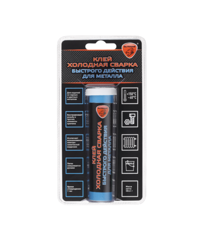Преимущества: Двухкомпонентный металлонаполненный полимерный состав высокой вязкости. Предназначен для быстрого и надежного склеивания, ремонта, герметизации соединений, а также для восстановления утраченных фрагментов изделий из разнородных металлов: стали и её сплавов, в т.ч. нержавеющих, алюминия, латуни. Исключает возникновение электрохимической коррозии на границе склеивания металлов. Незаменим, когда применение сварочных работ невозможно или нецелесообразно. Применяется также для восстановления утраченных фрагментов изделий из вышеперечисленных материалов, работающих при температурах от -60 ºС до +150 ºС. Отверждённый состав характеризуется высокой герметичностью и прочностью, выдерживает значительные статические и динамические нагрузки, а также механическую обработку (шлифовку, сверление, нарезку резьбы). Обеспечивает надежный ремонт на влажных и замасленных поверхностях. Устойчив к воздействию воды, антифриза, масел и других технических жидкостей.  Способ применения: Все работы по склеиванию должны производиться при температуре не ниже +5 ºС. Склеиваемые поверхности очистить от грязи и ржавчины, зачистить наждачной бумагой, обезжирить и просушить. Отрезать необходимую по объёму часть стержня и тщательно смешать оба компонента влажными руками (использовать перчатки) до получения равномерной окраски массы. Состав должен разогреться в руках и должен стать пластичным и липким. Полученную смесь немедленно нанести на ремонтируемую поверхность и, по возможности, прижать и зафиксировать на 1 час. Для разглаживания поверхности и придания ей необходимой формы использовать плоские предметы, смоченные водой. Неиспользованную часть клея упаковать обратно в пленку, поместить в тубу и плотно закрыть крышку.