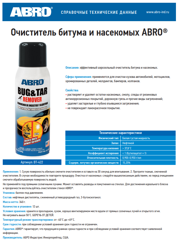 Очиститель битума и насекомых ABRO Описание Эффективный аэрозольный очиститель битума и насекомых. Сфера применения Применяется для очистки кузова автомобилей, мотоциклов, хромированных деталей, молдингов, бамперов, колпаков. Свойства • Растворяет и удаляет остатки насекомых, смолу, следы от резиновых антикоррозионных покрытий, дорожную грязь и прочие виды загрязнений. • Удаляет застарелые и глубоко въевшиеся загрязнения. • Не повреждает лакокрасочное покрытие. Применение ОЧИСТКА ОТ ГРЯЗИ И БИТУМНЫХ ПЯТЕН: 1. Обильно нанесите очиститель на загрязненные участки и оставьте на 30 секунд. 2. Смочите ткань очистителем и протрите поверхность кузова. 3. Тщательно смойте водой. В случае необходимости повторите обработку. ОЧИСТКА ОТ НАСЕКОМЫХ: Следуйте вышеописанным действиям. Перед удалением насекомых вместо очистителя смочите ткань водой. Не применяйте под прямыми солнечными лучами. Может оставлять разводы и помутнения на стёклах. Для достижения идеального блеска и прозрачности воспользуйтесь очистителем стёкол ABRO®. Состав Дистилляты нефтяные легкогидрированные, сольвент (нафта) нефтяной тяжелый ароматический, растворитель Стоддарда, изопропанол, 2-бутоксиэтанол, декстро-лимонен, сжиженный углеводородный газ.