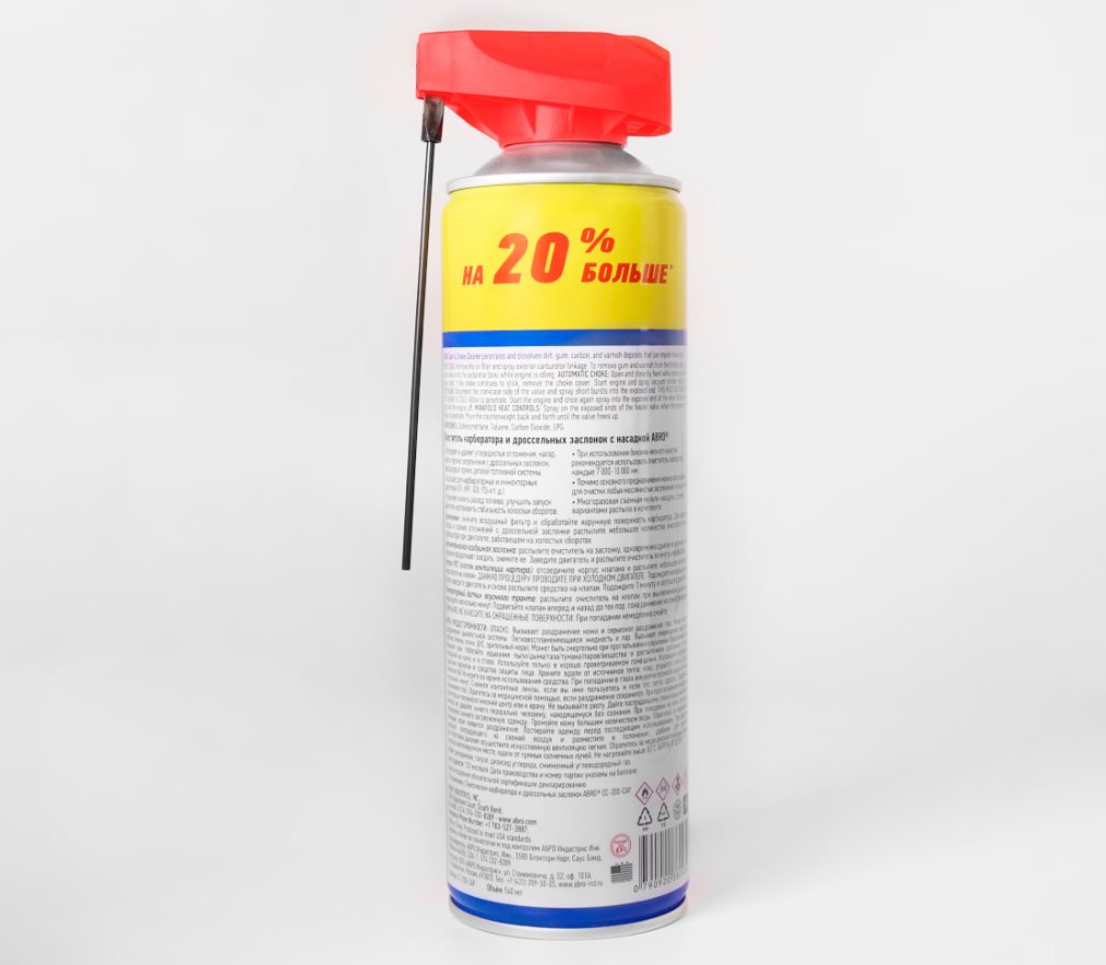 Высокоэффективный очиститель карбюратора и дроссельных заслонок.  • Растворяет и удаляет углеродистые отложения, нагар, масло и прочие загрязнения с дроссельных заслонок, карбюратора и прочих деталей топливной системы. • Подходит для карбюраторных и инжекторных двигателей (EFI, MPI, GDI, FSI и т. д.). • Позволяет снизить расход топлива, улучшить запуск двигателя, восстановить стабильность холостых оборотов. • При использовании бензина низкого качества рекомендуется использовать очиститель карбюратора каждые 7 000−10 000 км. • Помимо основного предназначения можно использовать для очистки любых маслянистых загрязнений, нагара, смазки. • Многоразовая съёмная мульти-насадка с двумя вариантами распыла в комплекте.