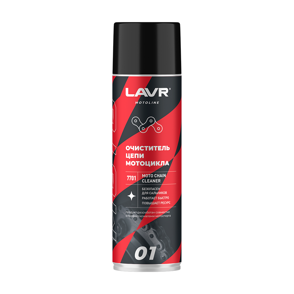 Специальное средство для быстрой очистки и обезжиривания всех типов приводных цепей мото- и велотехники. Расщепляет сложные въевшиеся загрязнения: смазку, дорожные и эксплуатационные загрязнения. Высокое давление в 5 атмосфер смывает грязь и смазку за считанные секунды. Совместим с устройствами для чистки цепи. Используется перед нанесением смазки. Характеристики:  Растворяет смазки, битум и ГСМ Смывает эксплуатационные загрязнения Безопасен для O, X, Y сальников Повышает адгезию смазки Обладает нейтральным запахом Тип товара: очиститель Область применения: мотоциклетная цепь Тип тары: аэрозоль Перед применением тщательно встряхнуть! Не применять на лакокрасочном покрытии! Распылить средство на цепь с расстояния 10 – 20 см. В случае сильных загрязнений очистить цепь неабразивной щеткой и повторить обработку. После очистки и высыхания нанести на цепь подходящую смазку LAVR. Использовать при температуре баллона выше +14°С.