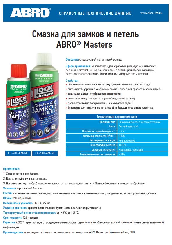 —Смазка для замков и петель ABRO MASTERS LL-200-AM-RE спрей, 200мл