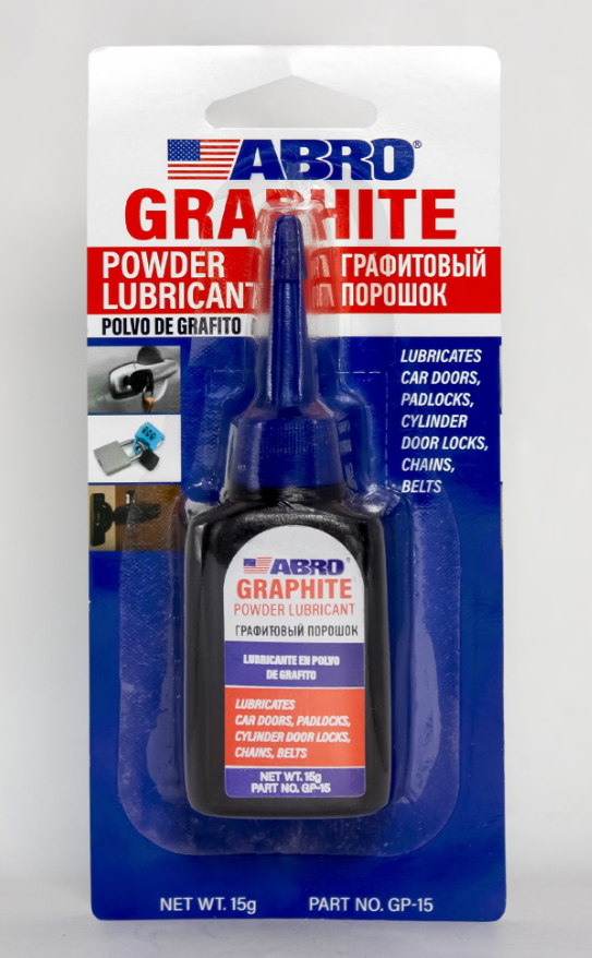 Порошок графитовый ABRO Описание: Высококачественный многоцелевой сухой графитовый порошок-смазка. Сфера применения: Используется для смазки металлических, деревянных, пластиковых, резиновых и прочих поверхностей. Идеален для обработки различных видов замков, в том числе цилиндрических, навесных, автомобильных. Используется для смазывания автомобильных петель, тросов тормозов и переключателей, цепей, ремней, роликовых колес, молний, щеколд, оконной фурнитуры, инструментов, а также рыболовных катушек и огнестрельного оружия. Свойства: Превосходно защищает от трения и износа, предотвращает заедание механизмов. Благодаря сухой формуле на обработанные детали не налипает пыль и грязь. Образует на поверхности долговечную термостойкую антифрикционную пленку. Защищает металлы от окисления и коррозии. Препятствует замерзанию обработанных деталей и механизмов. Обладает высокой электропроводностью. Не смывается водой. Может использоваться в качестве добавки к жидким смазкам для улучшения их свойств. Нетоксичен, безвреден, без запаха. Применение: Распылите порошок на обрабатываемые поверхности. Состав: Природный графит, кварц.