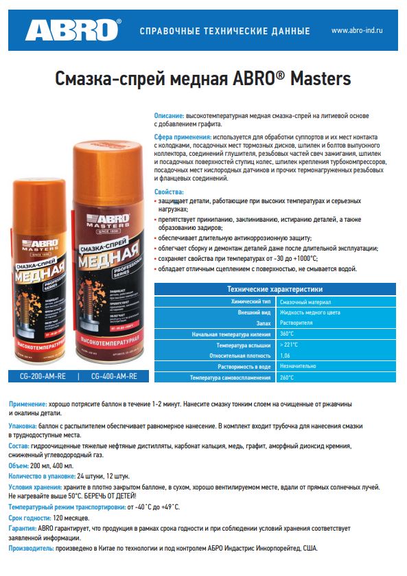 —Смазка медная ABRO MASTERS CG-200-AM-RE спрей, 200мл