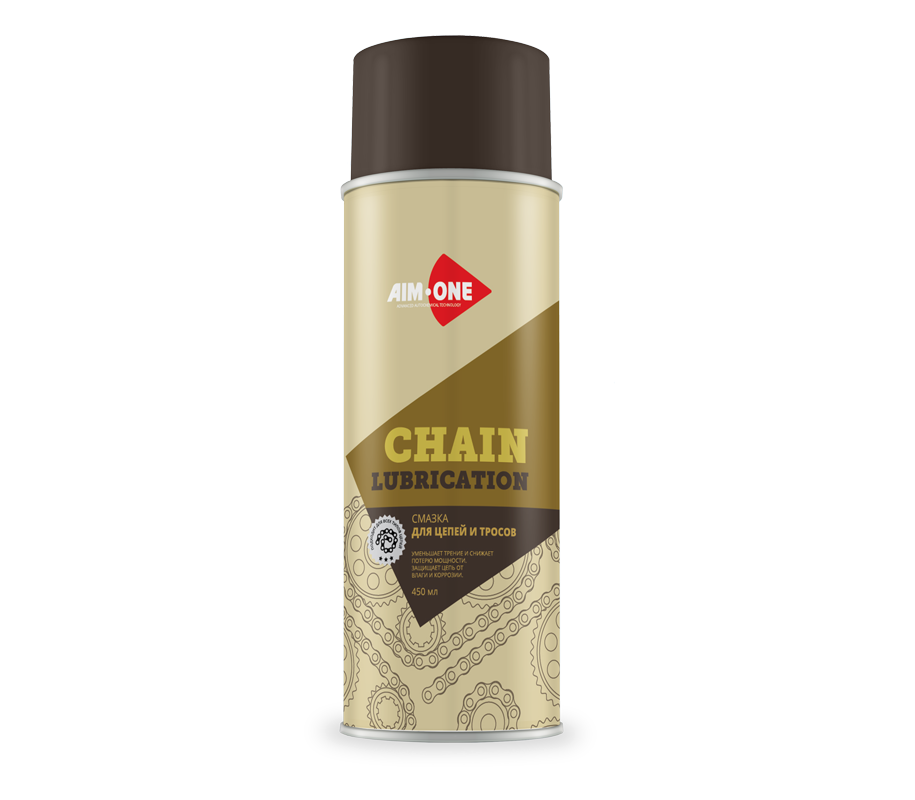 Смазка для тросов Aim-One быстро проникает вглубь материала и создает прочный защитный слой, который не смывается водой. Благодаря слою Chain Lubrication, трение деталей цепей уменьшается, что положительно отражается на долговечности механизмов. Также устраняются неприятные шумы, скрипы, скрежет. Специальная смазка для цепей и тросиков. Средство превосходно защищает металлические элементы от сильного трения, сокращая их преждевременный износ. Кроме того, уменьшается уровень шума в процессе работы механизмов. Рекомендуется использовать продукт для обслуживания велосипедных, мотоциклетных и любых других цепей, в том числе мотопил. Способ применения:  Встряхнуть баллон перед применением. Очистить обрабатываемую поверхность от грязи, песка, пыли или старых смазок. Нанести смазку тонким слоем. Подождать 10-15 минут (в зимнее время 20-30) перед эксплуатацией. Для точечного нанесения использовать специальную трубку. Рекомендуется смазывать цепь через каждые 500 км пробега, после каждого дождя или характерного скрипа песка.