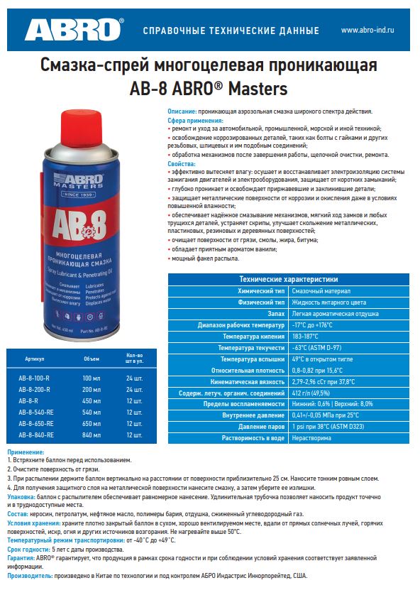 —Смазка универсальная ABRO MASTERS AB-8-100-R спрей, 100мл