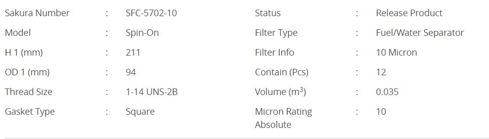 Фильтр топливный сепаратор SAKURA SFC-5702-10 (380094, FS 1022)