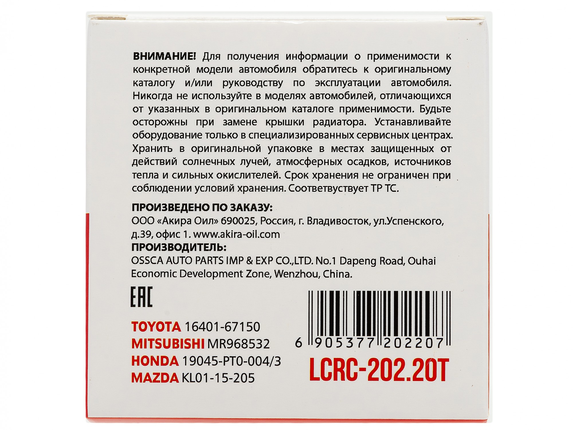 Крышка радиатора LCRC-202.2OT (108kpa, 1.1kg/cm2) OEM 16401-67150 TOYOTA (большой клапан) Крышки радиатора LivCar производятся по оригинальной технологии, в соответствии с ОЕМ-стандартами, только из высококачественных специальных материалов. Контроль качества на всех этапах производства. Крышки радиатора LivCar надежно защищают двигатель внутреннего сгорания от перегрева. Применимы для большинства пассажирских автомобилей (Запрещено использовать в грузовых автомобилях), в том числе гибридных. Применяйте крышку радиатора строго в соответствии с руководством по эксплуатации автомобиля.