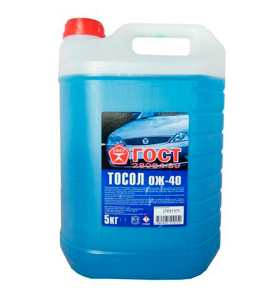Тосол ГОСТ ОЖ-40 - это низкозамерзающая охлаждающая жидкость на основе этилгликоля с температурой начала кристаллизации не выше - 40°С, соответствующая ГОСТ 28084-89. Этот отечественный стандарт распространяется на охлаждающие низкозамерзающие жидкости.  Особенности: Тосол предназначен для охлаждения двигателей внутреннего сгорания. Тосол ГОСТ ОЖ-40 РОЗНХП инертен к резиновым, неопреновым и керамическим деталям. Предназначен в качестве рабочих жидкостей в других теплообменных аппаратах, работающих при низких и умеренных температурах.