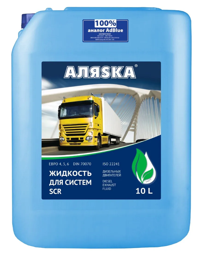 Первый продукт данного класса, выпущенный в России, изготовлен в полном соответствии с немецким стандартом DIN 70070 и международным ISO 22241 для рабочей жидкости AUS 32. Жидкость для систем SCR Аляsка - высококачественный реагент, представляющий собой раствор карбамида (мочевины) 32,5% в деминерализованной воде высокой степени очистки. Применяется в качестве рабочей жидкости в системах снижения токсичности SCR (Selective Catalytic Reduction - Селективный Каталитический Преобразователь) дизельных двигателей. Применение систем SCR на дизельных двигателях необходимо для достижения экологических нормативов Евро 4, Евро 5 и Евро 6 по выбросу вредных веществ. Жидкость для систем SCR Аляsка применяется в грузовых автомобилях экологического стандарта Евро 4 и Евро 5: Volvo, Mercedes-Benz, Iveco, DAF, Renault, Scania, MAN, Daewoo, MAZ, KAMAZ и других, а также в ряде дизельных легковых автомобилей. Соответствует: ISO 22241, DIN 70070, MB A 000 583 0107, VW / Audi G 052 910 A2, BMW Group 83 19 0 441 139, ГОСТ Р ИСО 22241-1-2012. Добровольная сертификация в Российской Федерации (сертификат № 0088607).