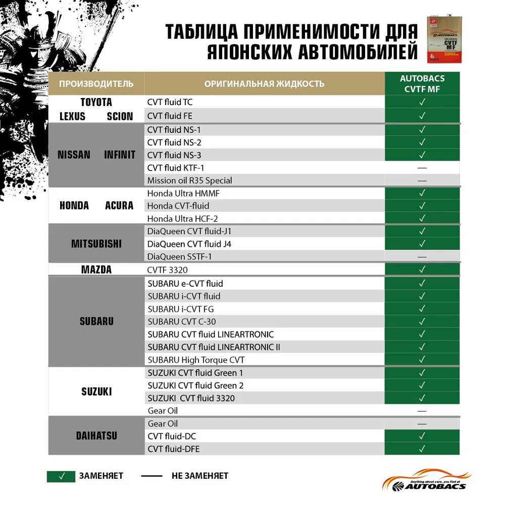 Полностью синтетическая трансмиссионная жидкость с длительным сроком службы для коробок передач вариаторного типа (CVT). Состоит из высококачественного синтетического базового масла и специальных присадок, обеспечивающих комплексную защиту трансмиссии CVT от износа. Обеспечивает стабильную работу КПП (CVT) как при низких, так и при высоких температурах. Рекомендована производителем для использования в большинстве современных КПП вариаторного типа (CVT) (согласно каталогам применимости). Применяется в качестве замены оригинальным жидкостям CVT: TOYOTA CVT fluid TC; CVT fluid FE; NISSAN CVT fluid NS-1, NS-2, NS-3; HONDA Ultra HMMF, CVTF 3320; MITSUBISHI CVT fluid-J1, J4; SUZUKI CVT fluid GREEN1, GREEN2 и др.   *Информация носит справочный характер. За подбором масел обращайтесь к оригинальным каталогам производителей автомобилей и/или в авторизованные сервисные центры.