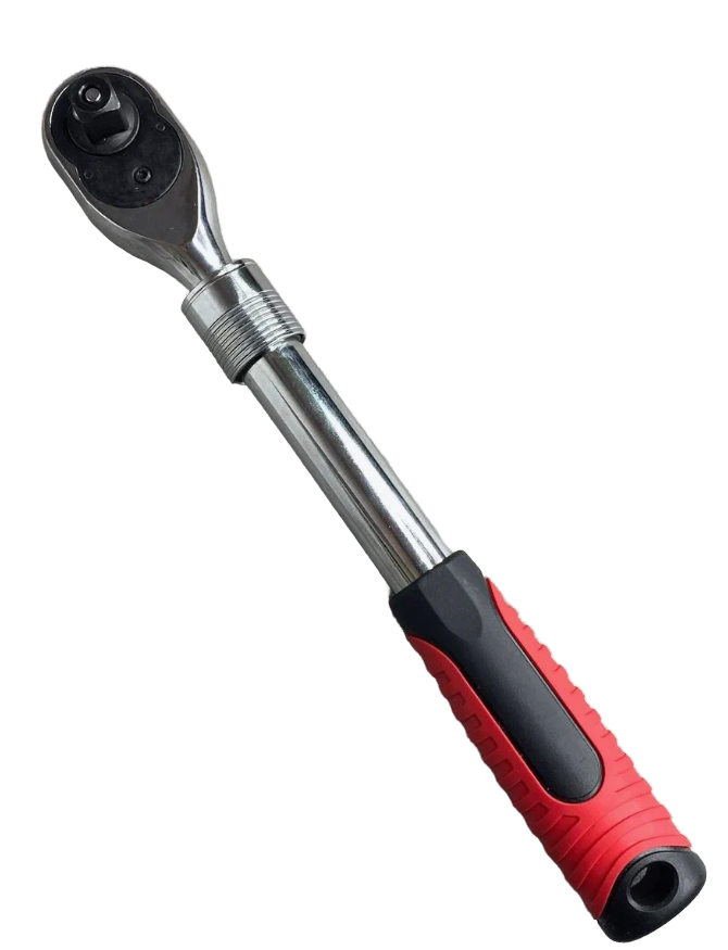 Ключ трещотка с посадочным квадратом 1/2" — это незаменимый инструмент для автолюбителя. Его флажковый механизм позволяет легко и быстро переключать рабочее направление вращения, что значительно упрощает процесс закручивания и откручивания крепежных элементов. Выдвижная конструкция ключа обеспечивает возможность регулировки длины от 315 мм до 455 мм, что делает его удобным для работы в ограниченных пространствах и позволяет достичь труднодоступных мест. Прорезиненная рельефная ручка обеспечивает надежный и комфортный захват, предотвращая скольжение даже при интенсивной работе.