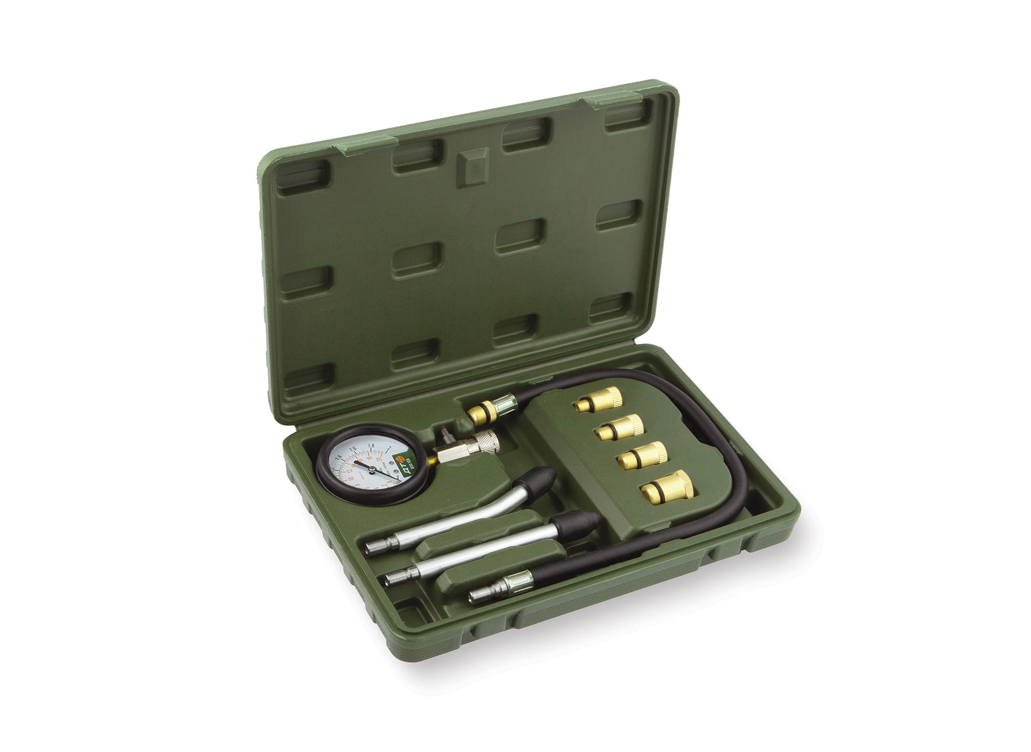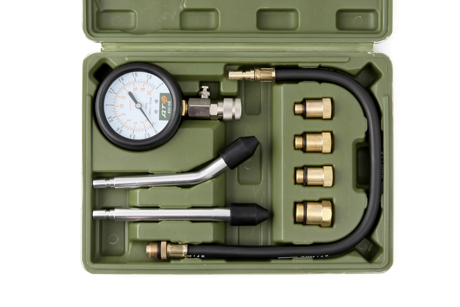 Набор используется для измерения компрессии в бензиновых двигателях в диапазоне 0–2,0 МПа (0–20 кгс/см2). Комплектация набора из резьбовых адаптеров М10—М18 и двух универсальных адаптеров конического типа позволяет применять компрессометр для диагностики большинства  моделей бензиновых двигателей. Состав набора: • Манометр 0–2,0 МПа (0–20 кгс/см2) с клапаном сброса давления • Шланг гибкий 400 мм • Насадка универсальная прямая с резиновым наконечником • Насадка универсальная изогнутая (30°) с резиновым наконечником • Адаптер M10×1.0 • Адаптер M12×1.25 • Адаптер M14×1.25  • Адаптер M18×1.5  • Пластиковый кейс