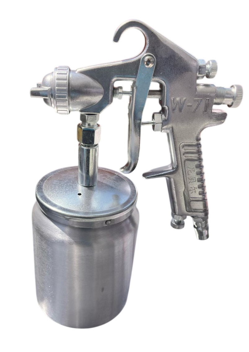 Краскопульт W-71 Универсальный окрасочный пистолет с поворотным бачком конвекциональной системы распыления. Рекомендуется для нанесения 1К синтетических красок, различных видов грунтов. Особенно удобен при окраске труднодоступных мест и небольших поверхностей. Имеет регулировку давления воздуха в нижней части ручки пистолета. Давление: +/- 3,5 бар Размер сопла: +/- 1.3 Расход воздуха: +/- 135 л/мин Вес: +/- 420 г