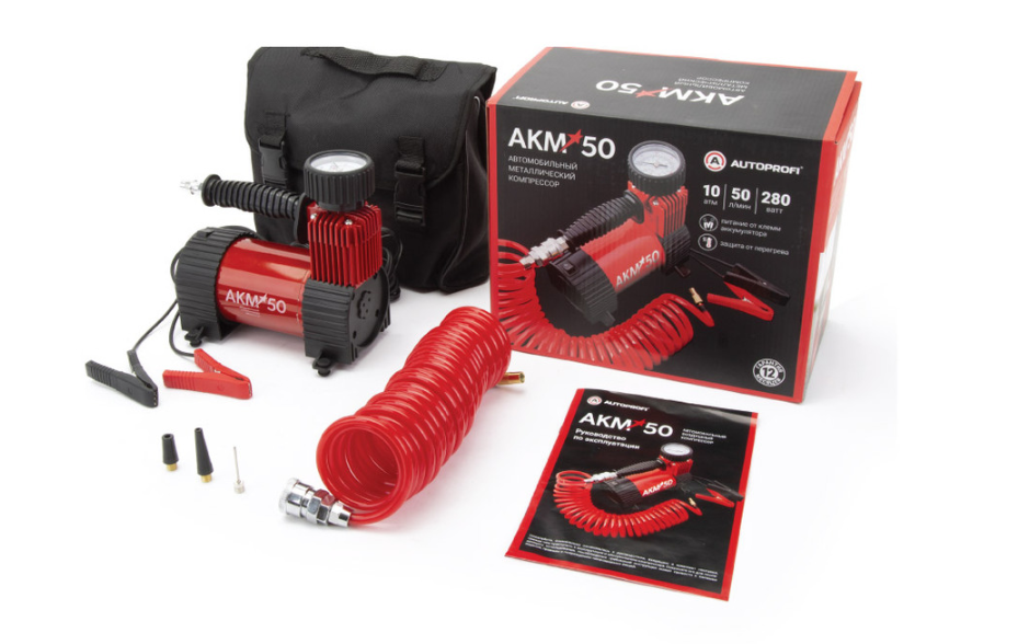 Компрессор воздушный AKM-50 Бренд - AUTOPROFI Производительность - 50л/мин., 12v/23A. Питание от клемм АКБ. Защита от перегрева. Сумка. Набор из 3-х переходников. Съемный шланг 5м длиной.