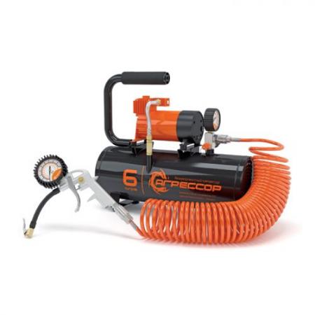 Автомобильный металлический компрессор с ресивером. Производительность — 35 л/мин. Объем ресивера — 6 литров. Время заполнения бака — 4 минуты. В комплекте идет переходник для подключения пневмоинструмента. Компрессор питается от прикуривателя или аккумулятора (переходник в комплекте). Гарантия 3 года. Особенности: автоматическое отключение после заполнения ресивера или достижения нужного давления в шинах и двухшкальный манометр на рукоятке. 10-метровый шланг сделан из полиуретана. Поршень насоса оснащен уплотнительным кольцом из гибкого жаропрочного тефлона. Производительность поршневого компрессора составляет 35 л/мин, это позволяет заполнить ресивер сжатым воздухом за 4 минуты. При достижении в ресивере максимально допустимого давления компрессор автоматически отключается и включается, когда давление в ёмкости начинает снижаться. Подача воздуха в шину или в пневмоинструмент осуществляется непосредственно из ресивера. Металлический корпус компрессора устойчив к коррозии и эффективно охлаждается во время работы. Поршень двигателя оснащён уплотнительным кольцом из гибкого жаропрочного тефлона, которое обеспечивает продолжительную безотказную работу насоса. Для смазки применяется несменяемое силиконовое масло. Комплектация: — Переходник для подключения пневмоинструмента — Пистолет для накачивания шин — Шланг-удлинитель — Инструкция по эксплуатации — Переходник с штекера прикуривателя на клеммы АКБ