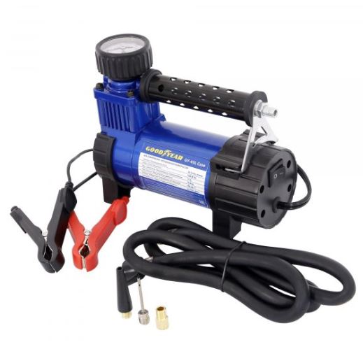 Воздушный компрессор Goodyear GY-45L предназначен для накачивания  автомобильных и велосипедных шин, резиновых лодок, мячей, матрасов. Особенности: Компрессор GY-45L поставляется в пластиковом кейсе. Питание компрессора осуществляется от АКБ автомобиля. Флажковый предохранитель в капсуле на контактном проводе.  Устройство имеет увеличенное время непрерывной работы – до 30 минут. В комплект входит набор насадок-переходников, который делает компрессор универсальным в использовании. Компрессор GY-45L оснащен высокоточным манометром с минимальной погрешностью измерений не более 5%. Флажковый предохранитель в капсуле защищает электрическую цепь автомобиля и компрессора от скачков тока. Корпус и поршневая группа компрессора GY-45L сделаны из металла, что обеспечивает повышенную прочность и увеличенный ресурс.