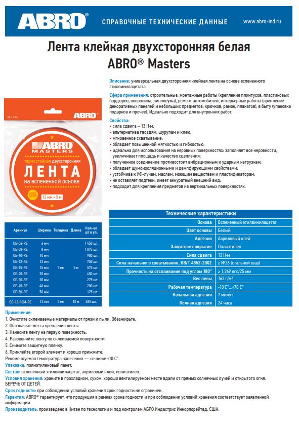 Описание: универсальная двухсторонняя клейкая лента на основе вспененного этилвинилацетата. Сфера применения:  строительные, монтажные работы (крепление плинтусов, пластиковых бордюров, ковролина, линолеума), ремонт автомобилей, интерьерные работы (крепление декоративных панелей и небольших предметов: крючков, рамок, плакатов), в быту (упаковка подарков и прочее). Идеально подходит для внутренних работ. Свойства:  • прочность на отслаивание – 1,269 кгс/25мм; • альтернатива гвоздям, шурупам и клею; • обладает повышенной мягкостью и гибкостью; • идеальна для использования на неровных поверхностях: заполняет все неровности, увеличивает площадь и качество сцепления; • мгновенное схватывание; • полученное соединение противостоит вибрационным и ударным нагрузкам; • обладает шумоизоляционными и демпфирующими свойствами; • устойчива к УФ-лучам, маслам, моющим веществам и пластификаторам; • рабочая температура: от -10 до +70°С; • не оставляет подтеки, имеет аккуратный внешний вид; • подходит для крепления предметов на вертикальных поверхностях. Применение: 1. Очистите склеиваемые материалы от грязи и пыли. Обезжирьте. 2. Обозначьте места крепления ленты. 3. Нанесите ленту на первую поверхность. 4. Разровняйте ленту по склеиваемой поверхности. 5. Снимите защитную пленку. 6. Приклейте второй элемент и хорошо прижмите. Рекомендуемая температура нанесения — не ниже +10°С. Состав: вспененный этилвинилацетат, акриловый клей, полиэтилен.